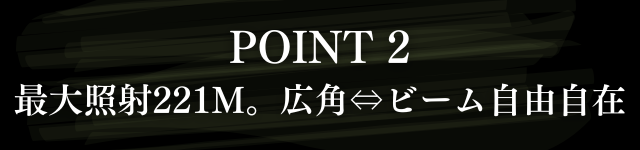 そしてこの『XENON C6Pro(ゼノンシーシックスプロ)』の最大の特徴とも言えるのが、照射角度90度にもおよぶ超広角照射と最大221メートルまで届くビーム照射が切り替えられるデュアルライト構造。