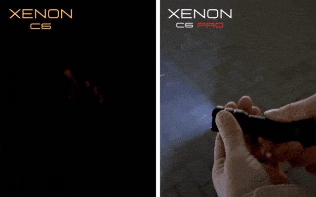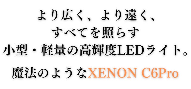 XENON C6Proは最大800ルーメン×9000Kという高輝度LEDユニットに加えて、独自設計の球形レンズにより、光を収束させ、より遠く、より強い光をビームのように照射します。