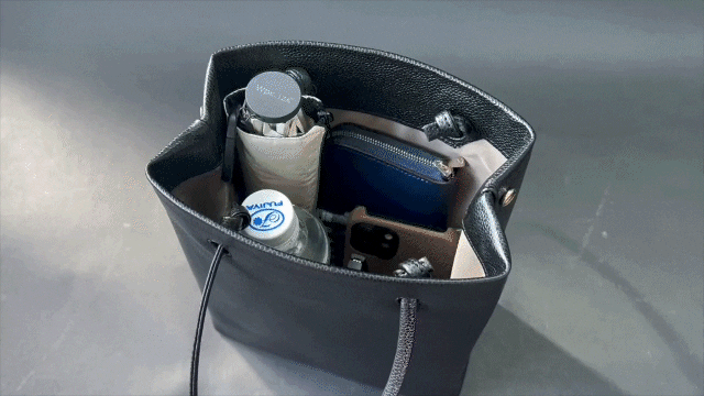 と思ったことはありませんか?大人革袋 小には明るめのグレー系の裏地を採用したので、バッグを広げた時光が反射するので明るく見えやすいので取り出したいものをすぐに見つけることができます!