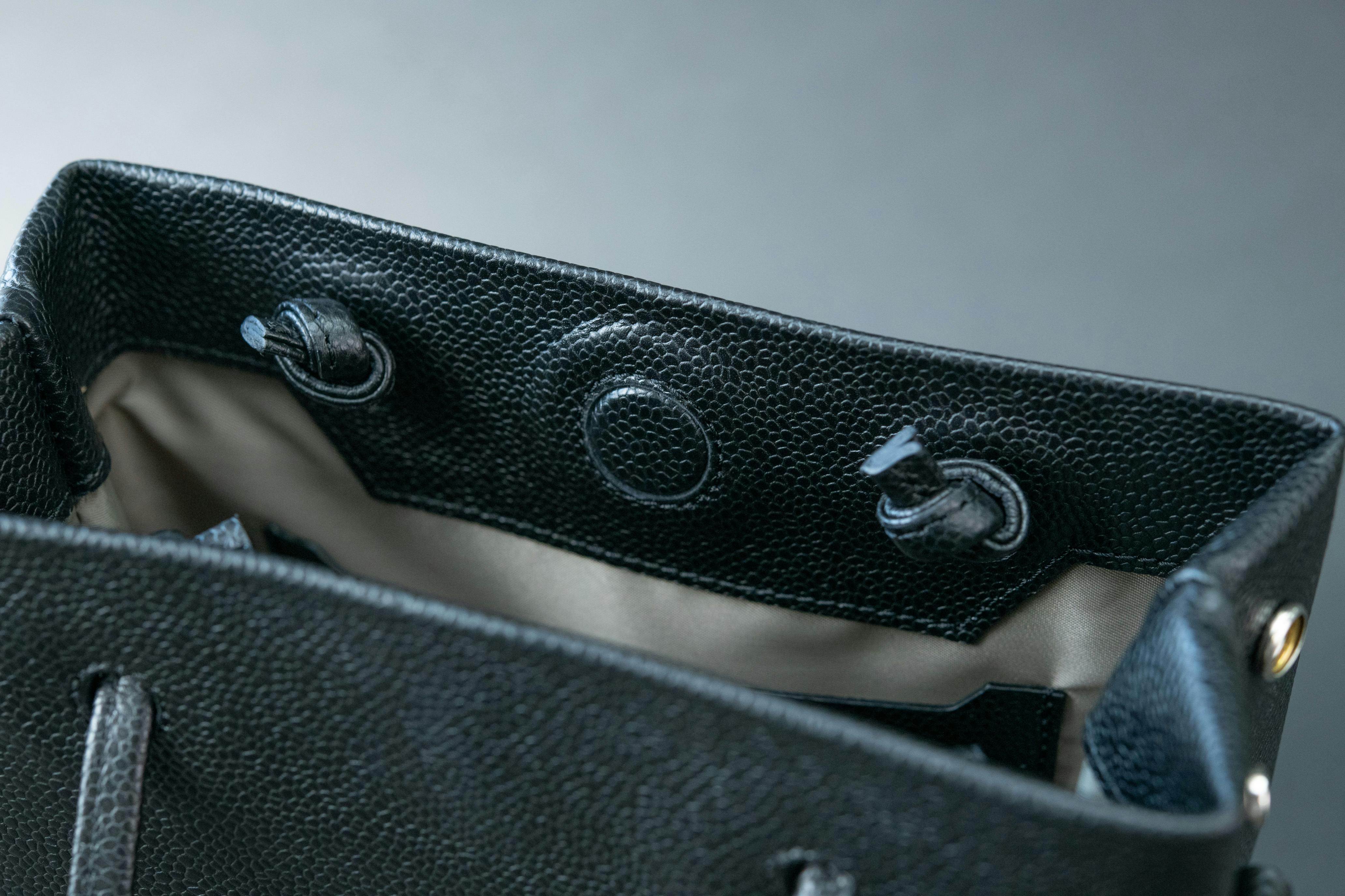 今回は革からこだわりました!!キャビアスキンは、有名ハイブランドのバッグにも使われている革です。牛革よりは繊維が細かいため、耐久性も他の牛革に比べて強くなっています。