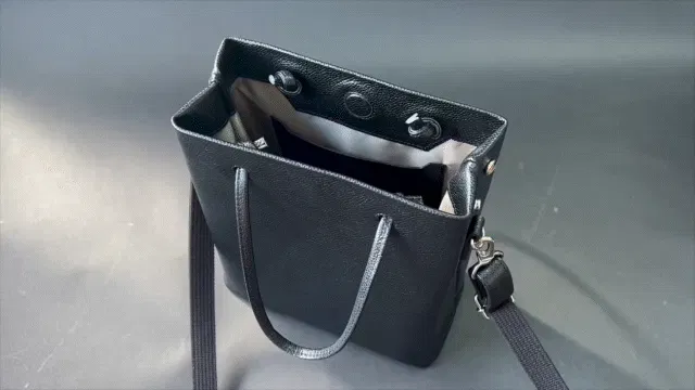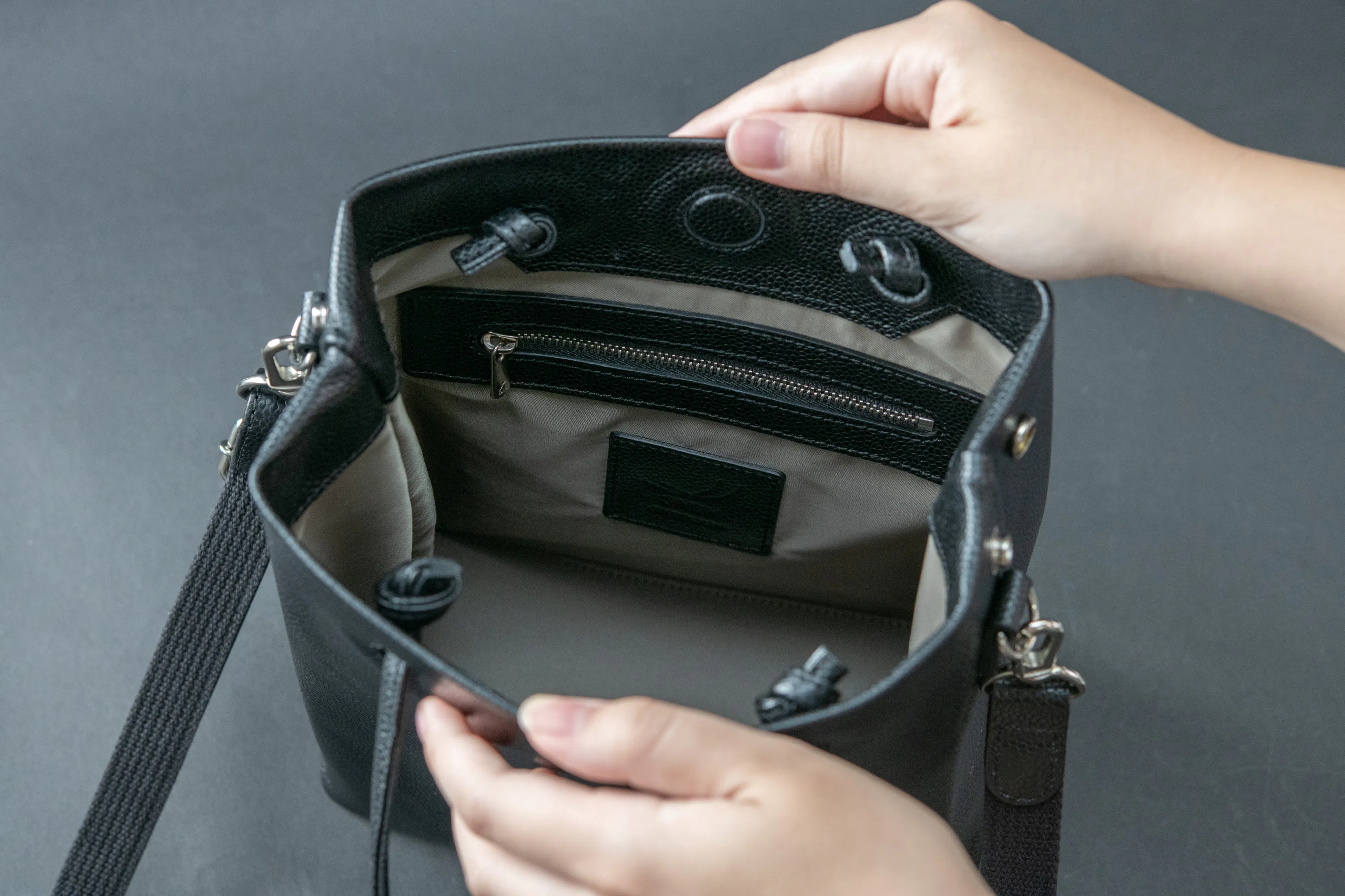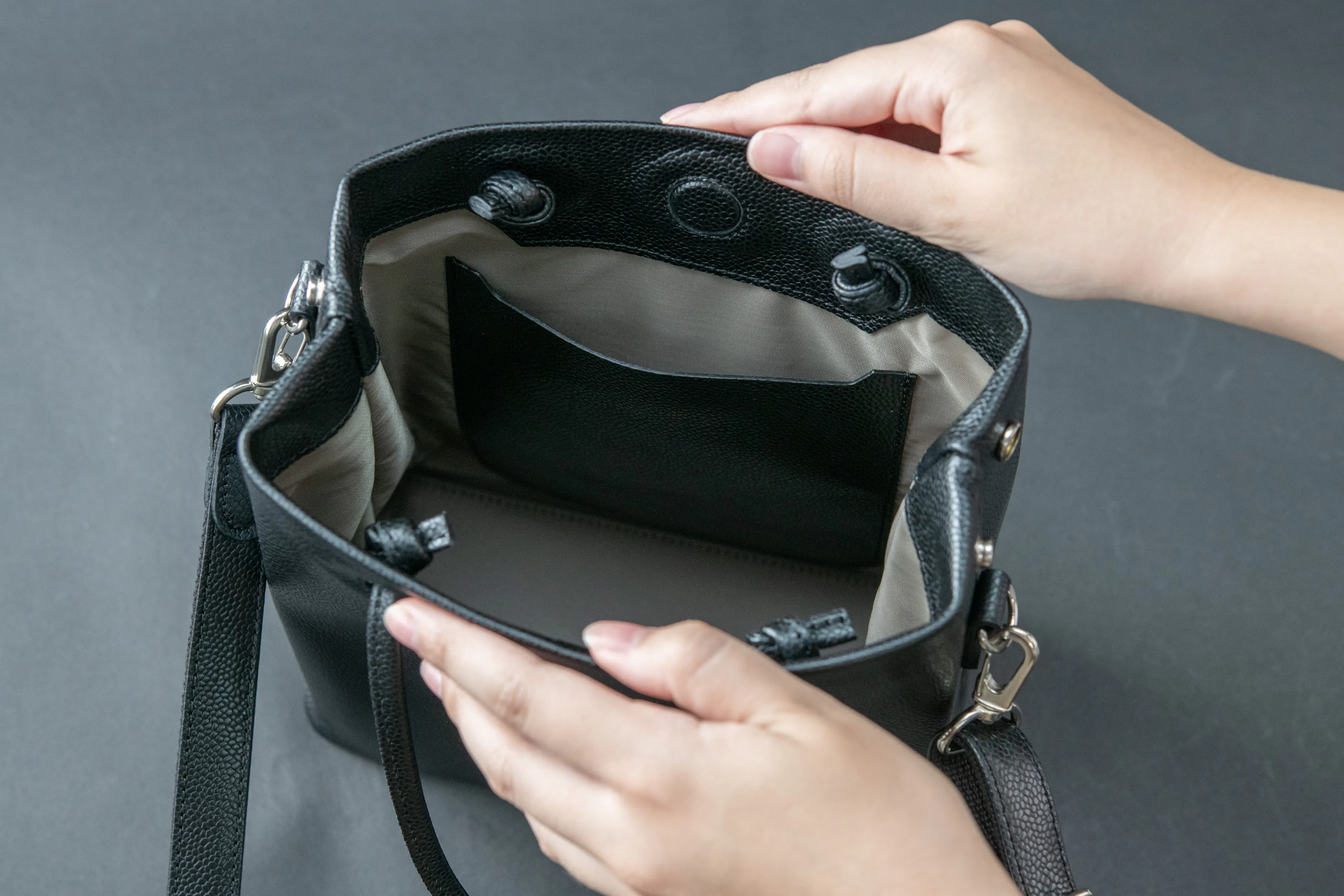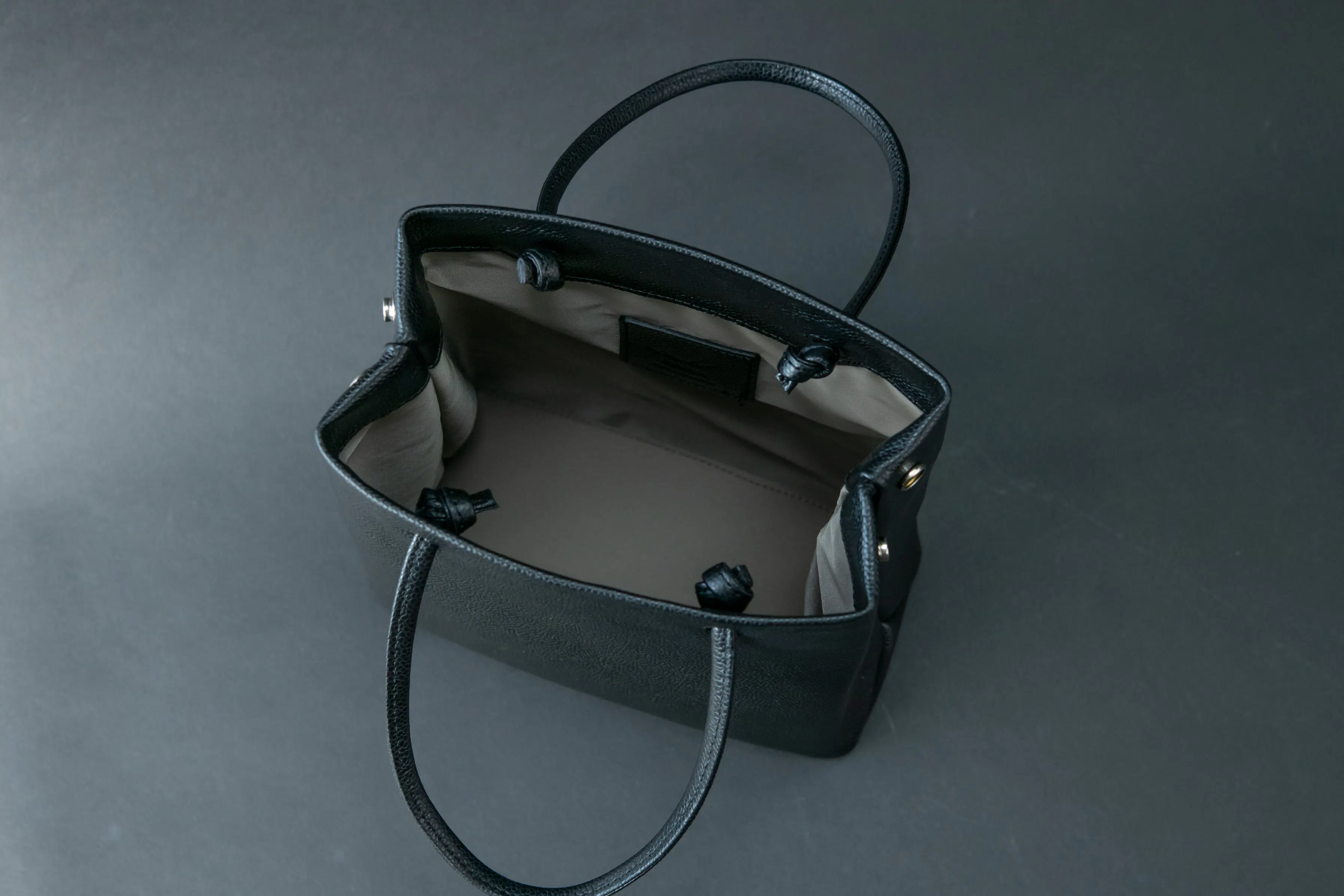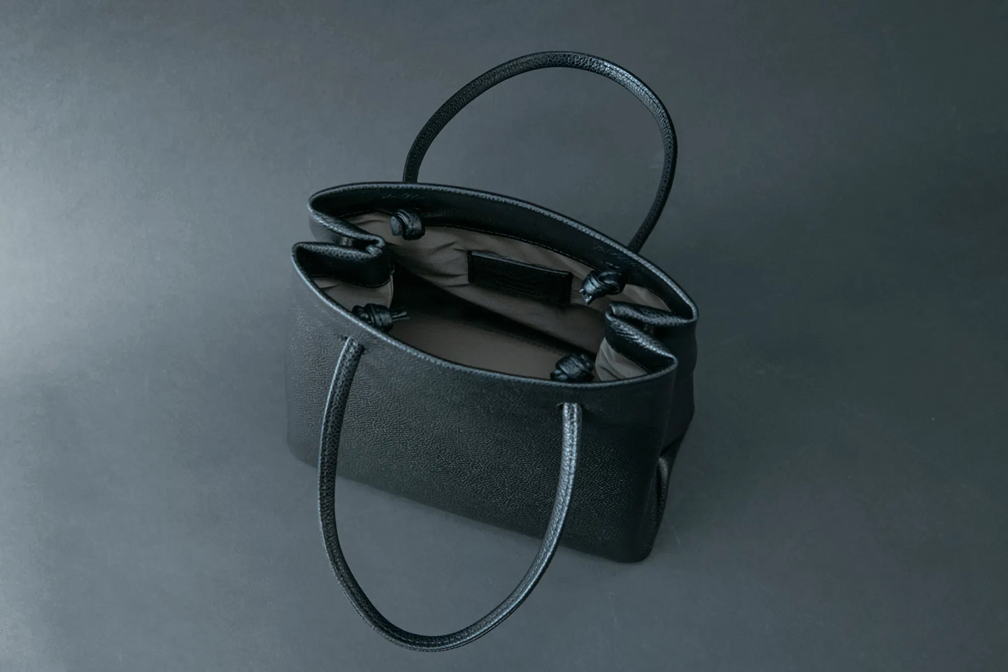 と思ったことはありませんか?大人革袋 小には明るめのグレー系の裏地を採用したので、バッグを広げた時光が反射するので明るく見えやすいので取り出したいものをすぐに見つけることができます!
