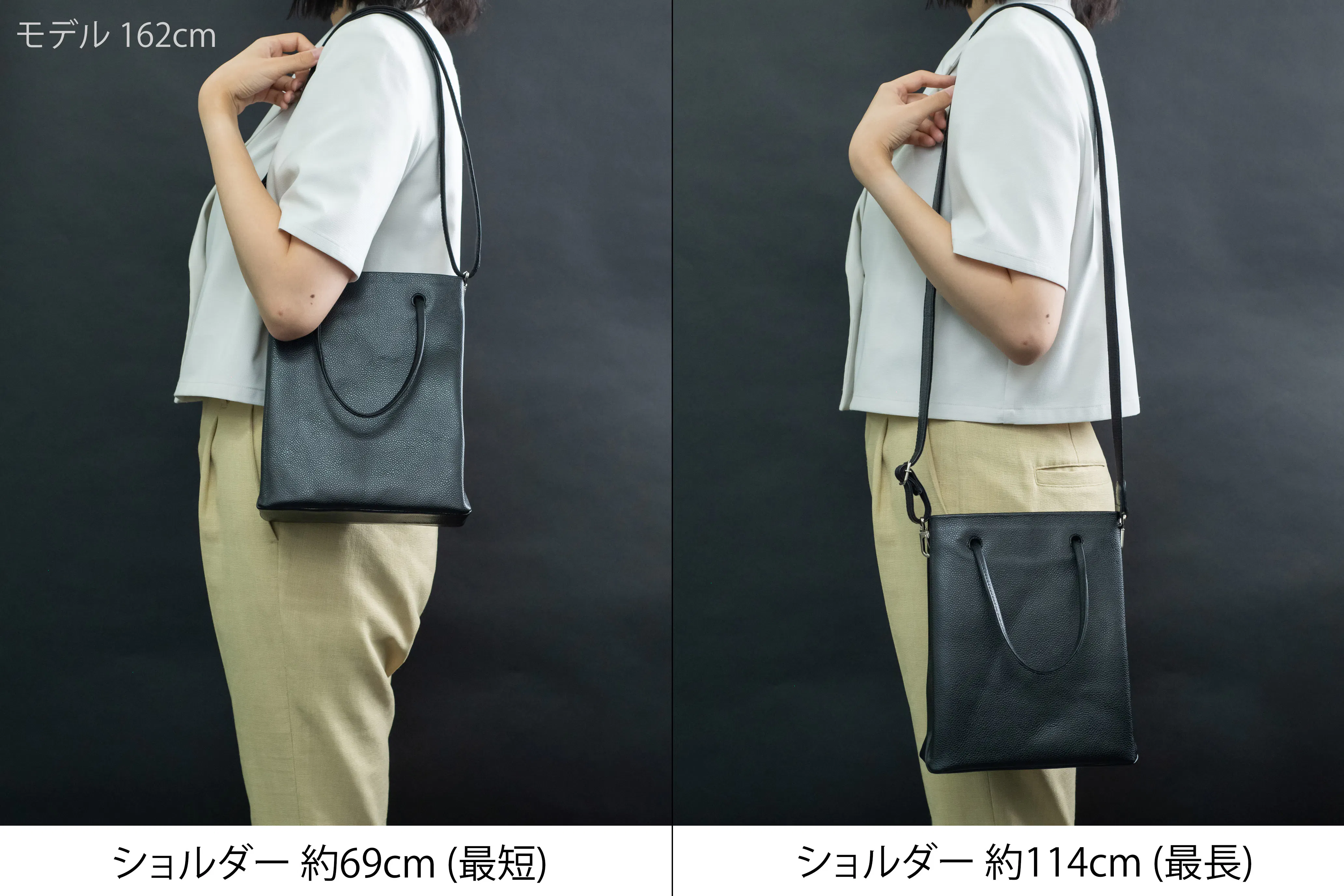 ▼表面はキャビアスキンレザー、裏面は肩から滑り落ちないようにアクリルテープで製作しております。