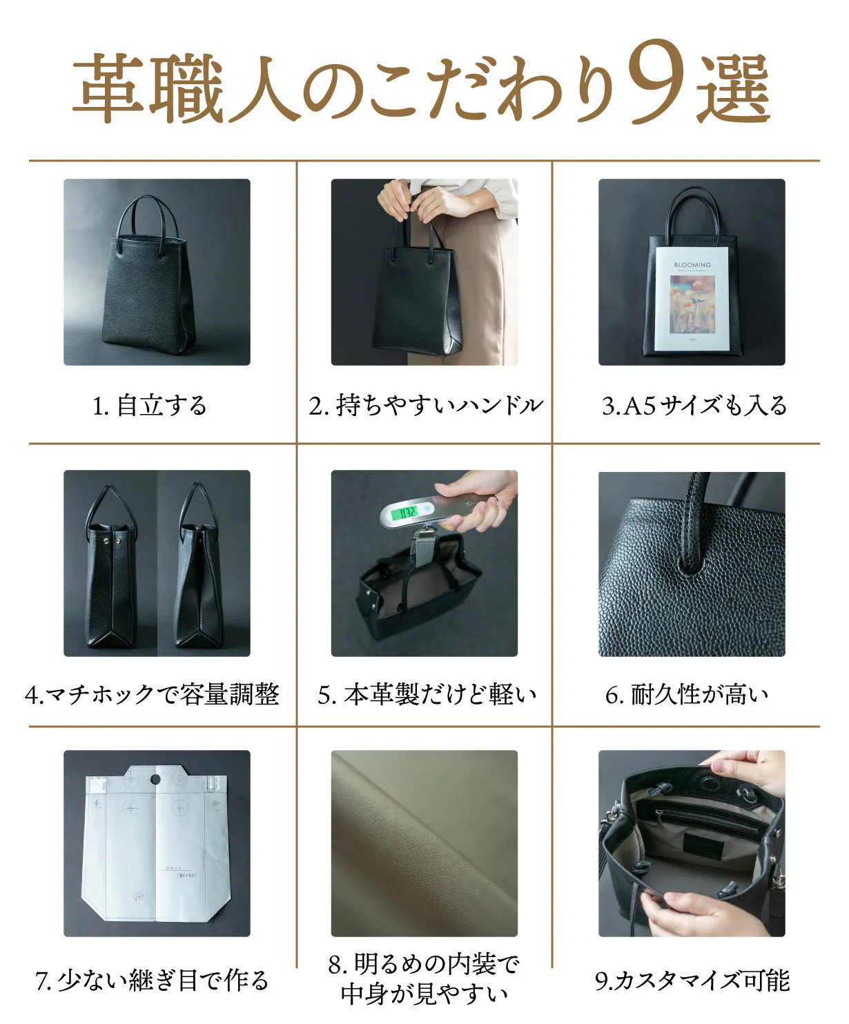 革の継ぎ目を減らして作ることにより、見た目がよく、高級感が増すことはもちろん、継ぎ目が少ないことで強度も増します。