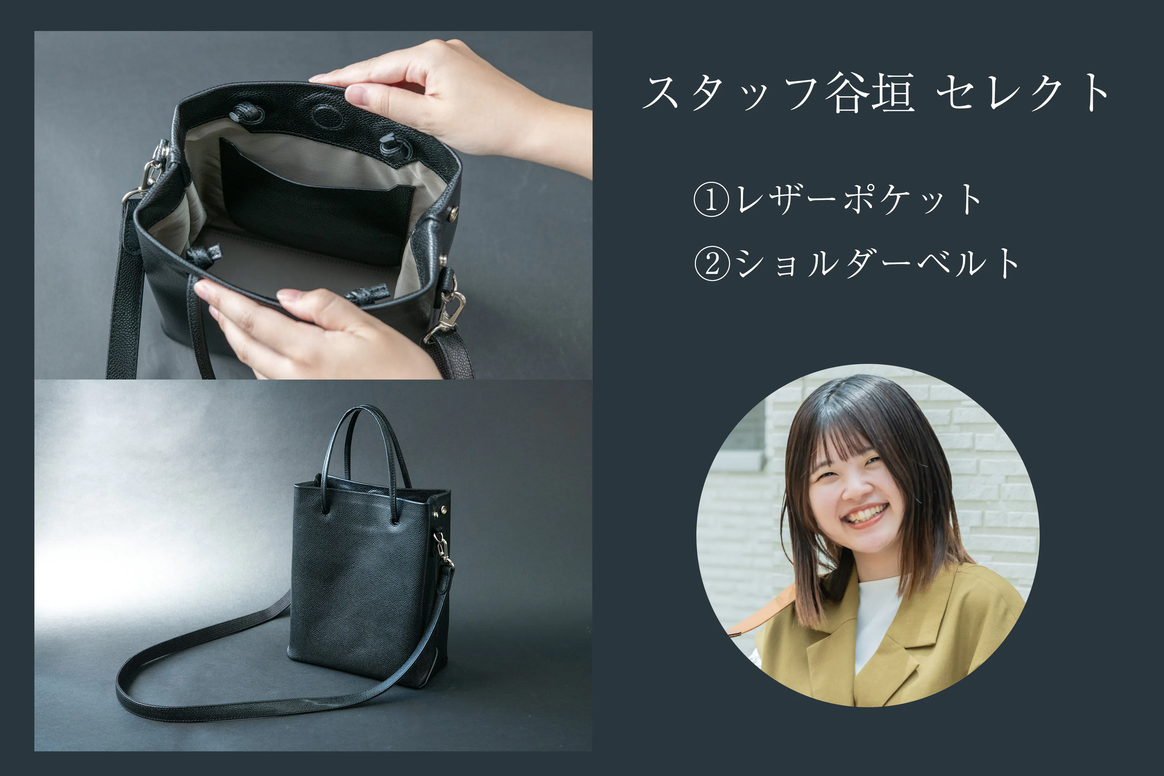 クリエイティブ担当の谷垣です!普段ショルダーバッグを愛用しており、カバンで手が塞がるのがイヤなので、ショルダーベルトは私にとって必須オプションです!加えて、仕分けのためにポケットが欲しかったのですが、チャックの開け閉めが面倒な私は、サッと物が取り出せるレザーポケットを選びました!