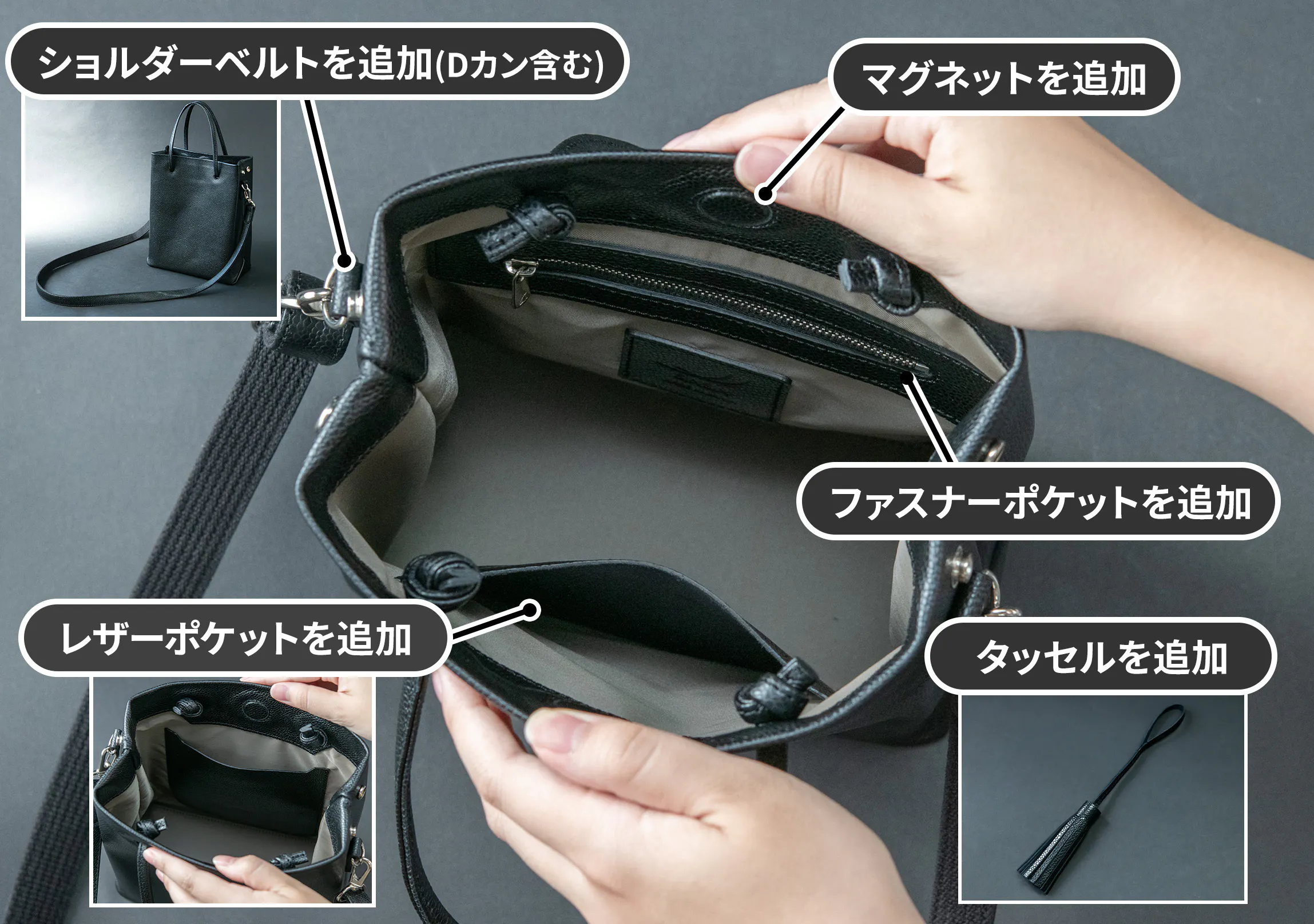 オプションを追加することによって自分のライフスタイルに合わせたバッグを作ることができます!
