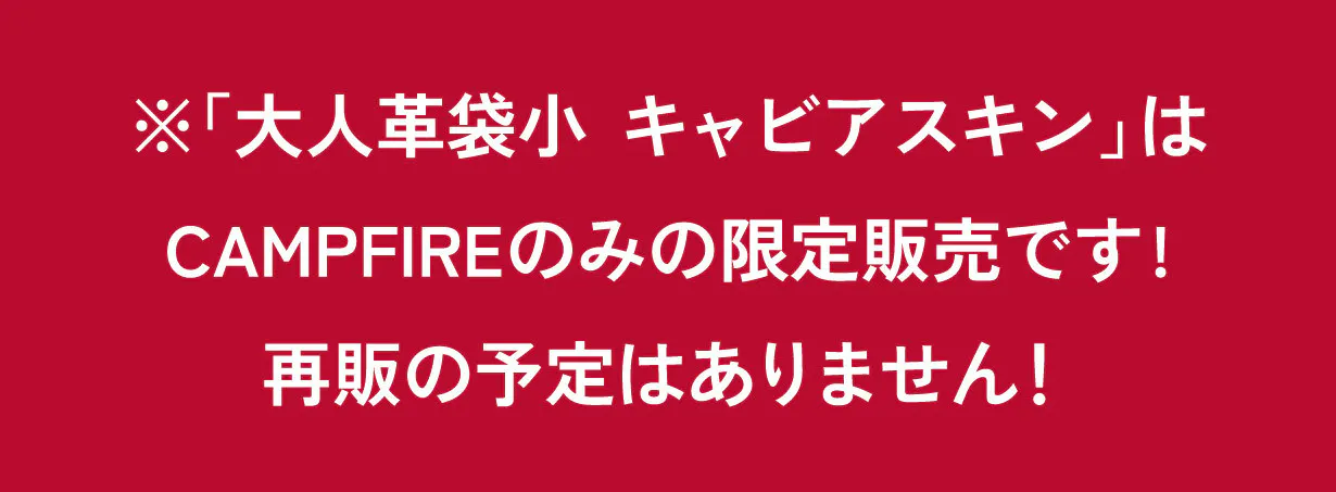 重ね重ねになりますが、「大人革袋小 キャビアスキン」はCAMPFIREで今回ばかりの販売となります。再販の予定は今のところございませんので、ぜひこのチャンスにお買い求めください!