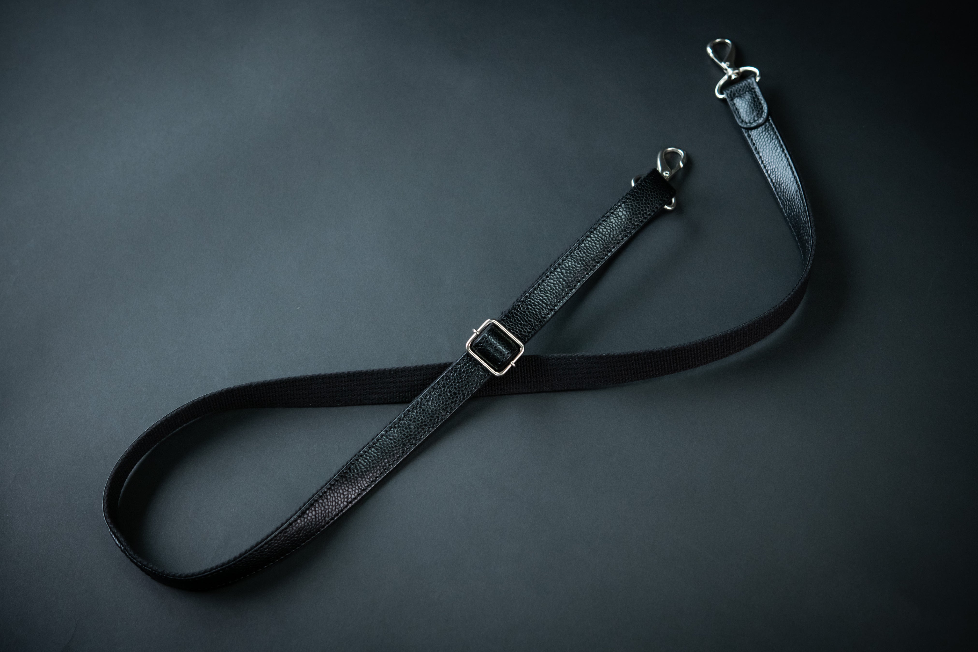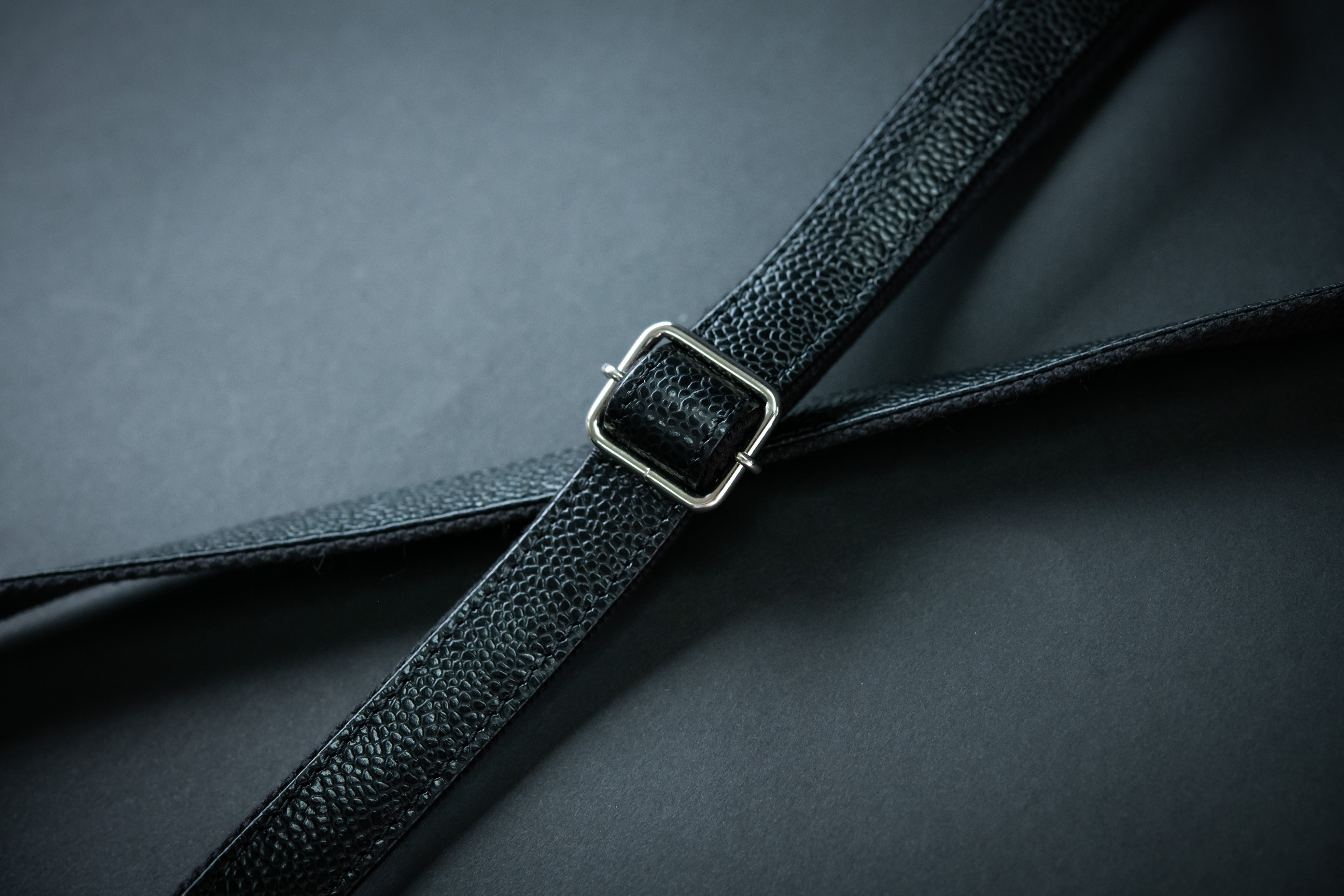 ▼表面はキャビアスキンレザー、裏面は肩から滑り落ちないようにアクリルテープで製作しております。