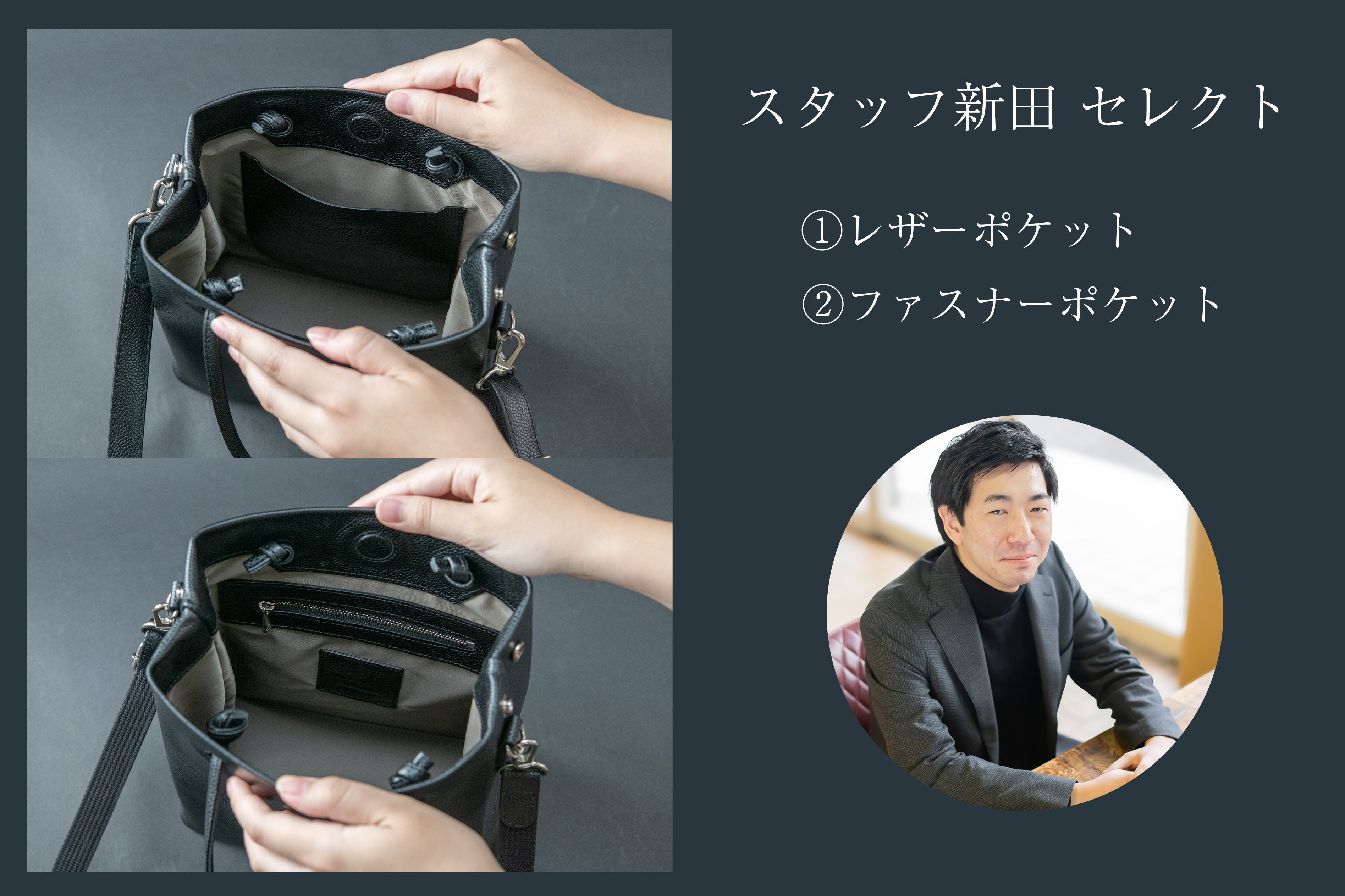 クリエイティブ担当の谷垣です!普段ショルダーバッグを愛用しており、カバンで手が塞がるのがイヤなので、ショルダーベルトは私にとって必須オプションです!加えて、仕分けのためにポケットが欲しかったのですが、チャックの開け閉めが面倒な私は、サッと物が取り出せるレザーポケットを選びました!