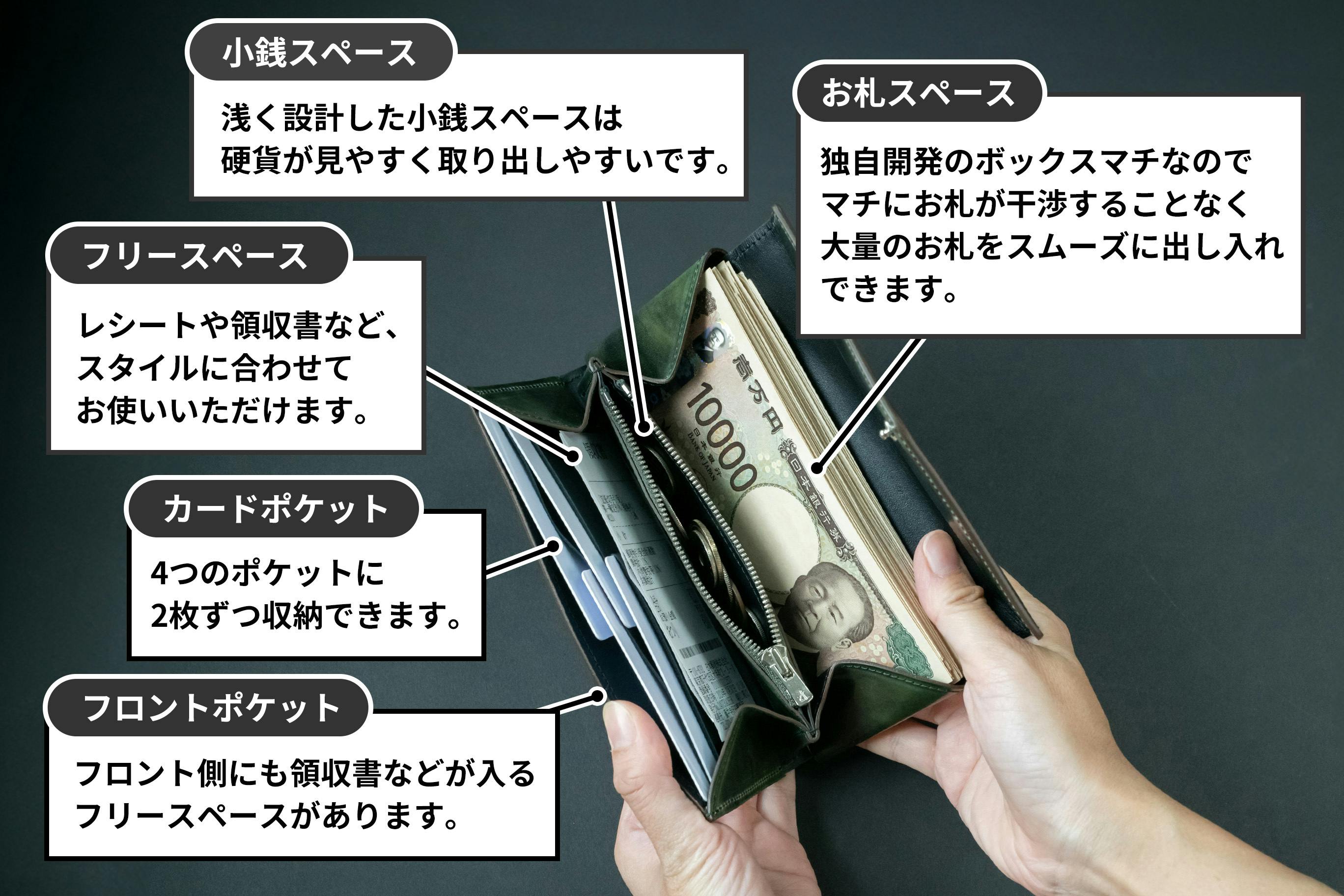 ボックス型マチはお札がマチにひっかかることがないのでスムーズにストレスなく出し入れできます。