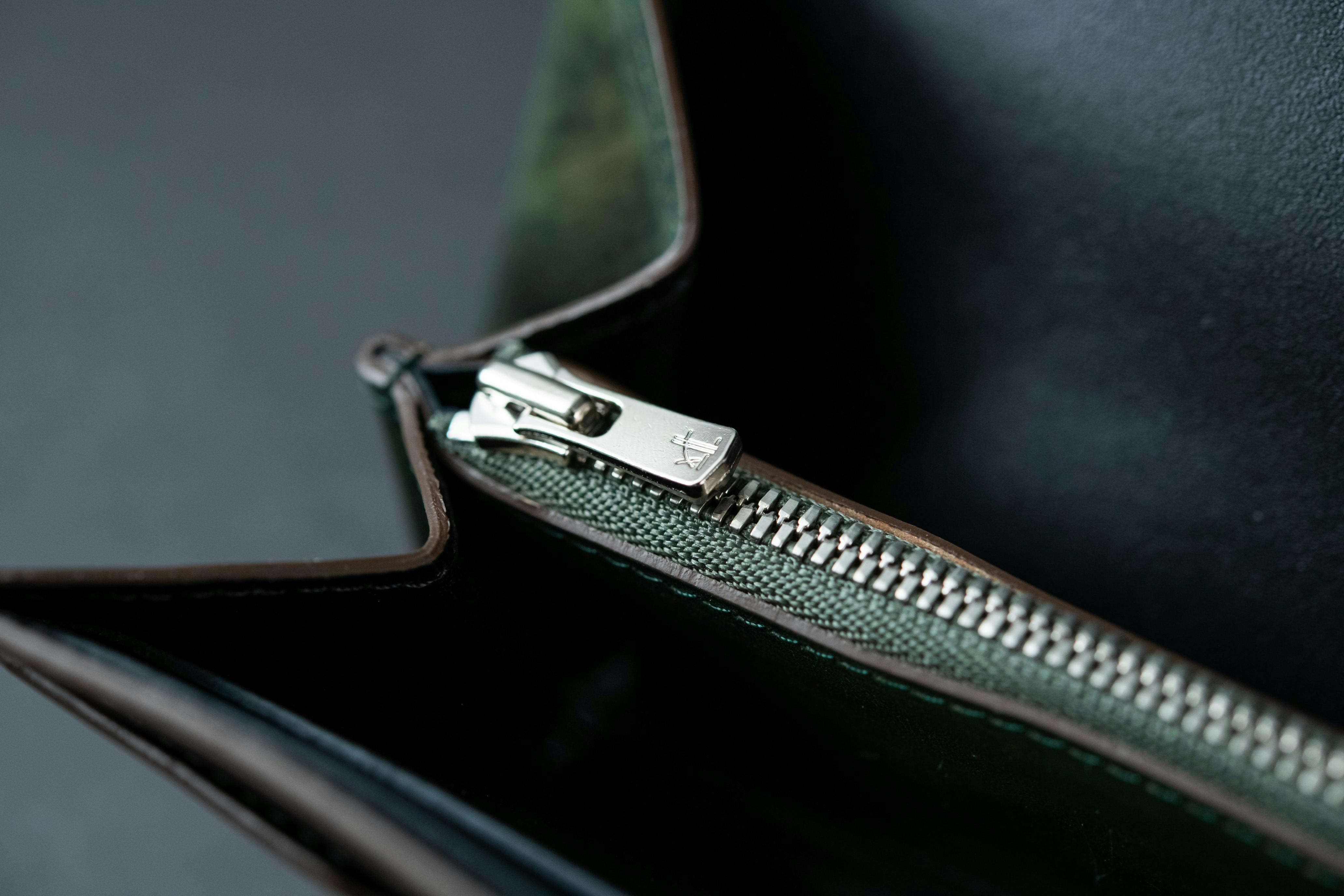 キラキラと輝くシルバーカラーの金属ファスナーは高級感と耐久性を兼ね備えたYKKが生んだファスナーです。