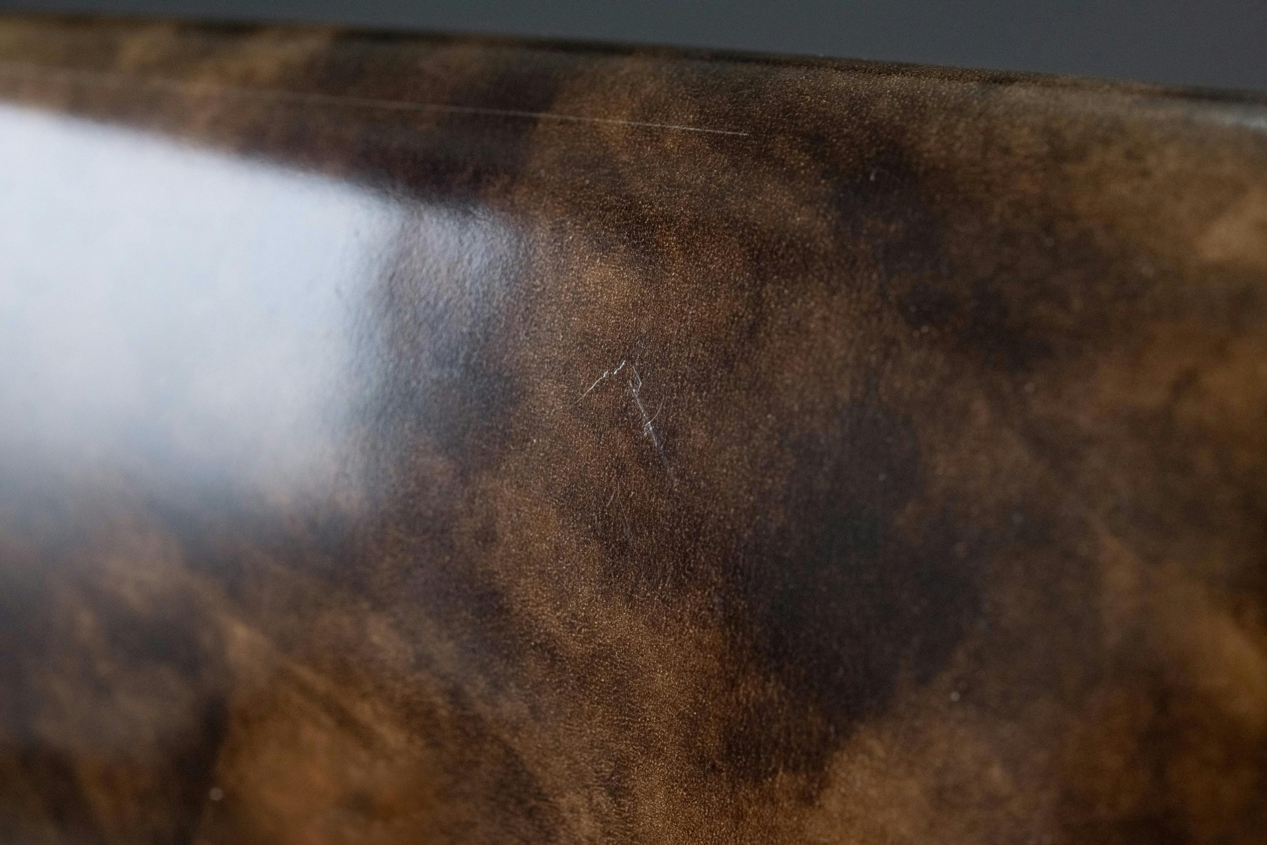コードバンはキメが細かくスムースな表面なので傷に弱く、また光沢感が強いため細かな傷も目立ちやすいです。自然本来の本革を使用しているため、合成皮革では見ることのできない天然の風合いとして、ご了承いただければ幸いです。気になる方はお気軽にカスタマーサポートまでご連絡ください。