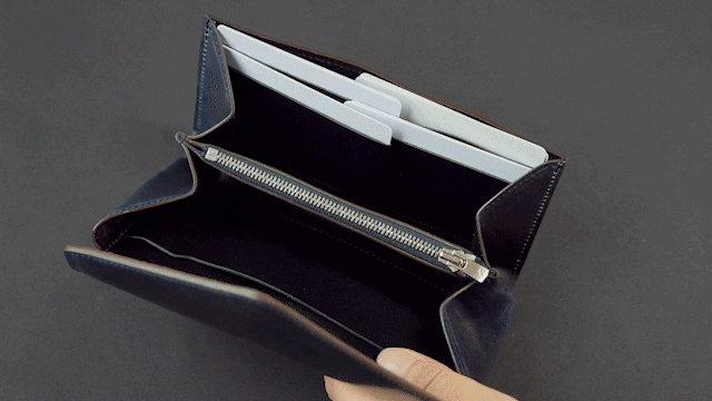 「キャッシュレス時代の極小長財布」をテーマに、数多くの「フラップ長財布」を作った実績のある財布職人の私たちが試行錯誤を重ねて、ようやく辿りついた「もうこれ以上小さくするのは無理!!」と音をあげた、極小のフラップ長財布です。