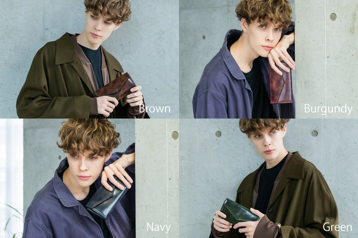 左から グリーン・バーガンディ・ネイビー・ブラウンとなります。
