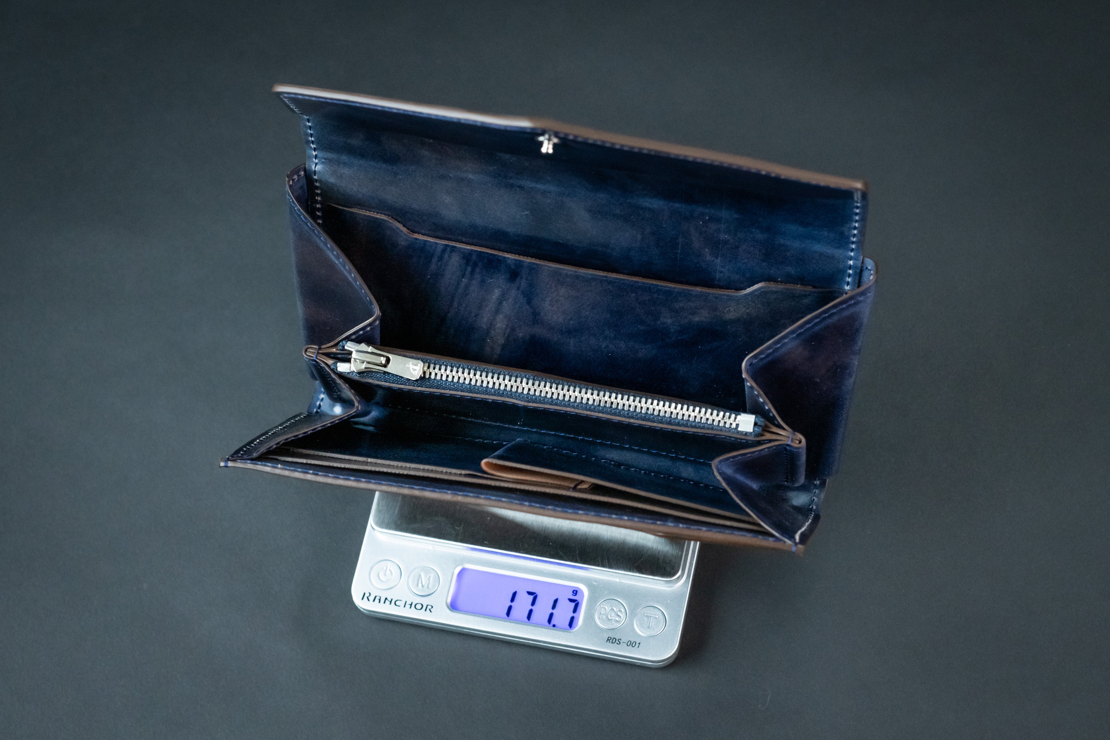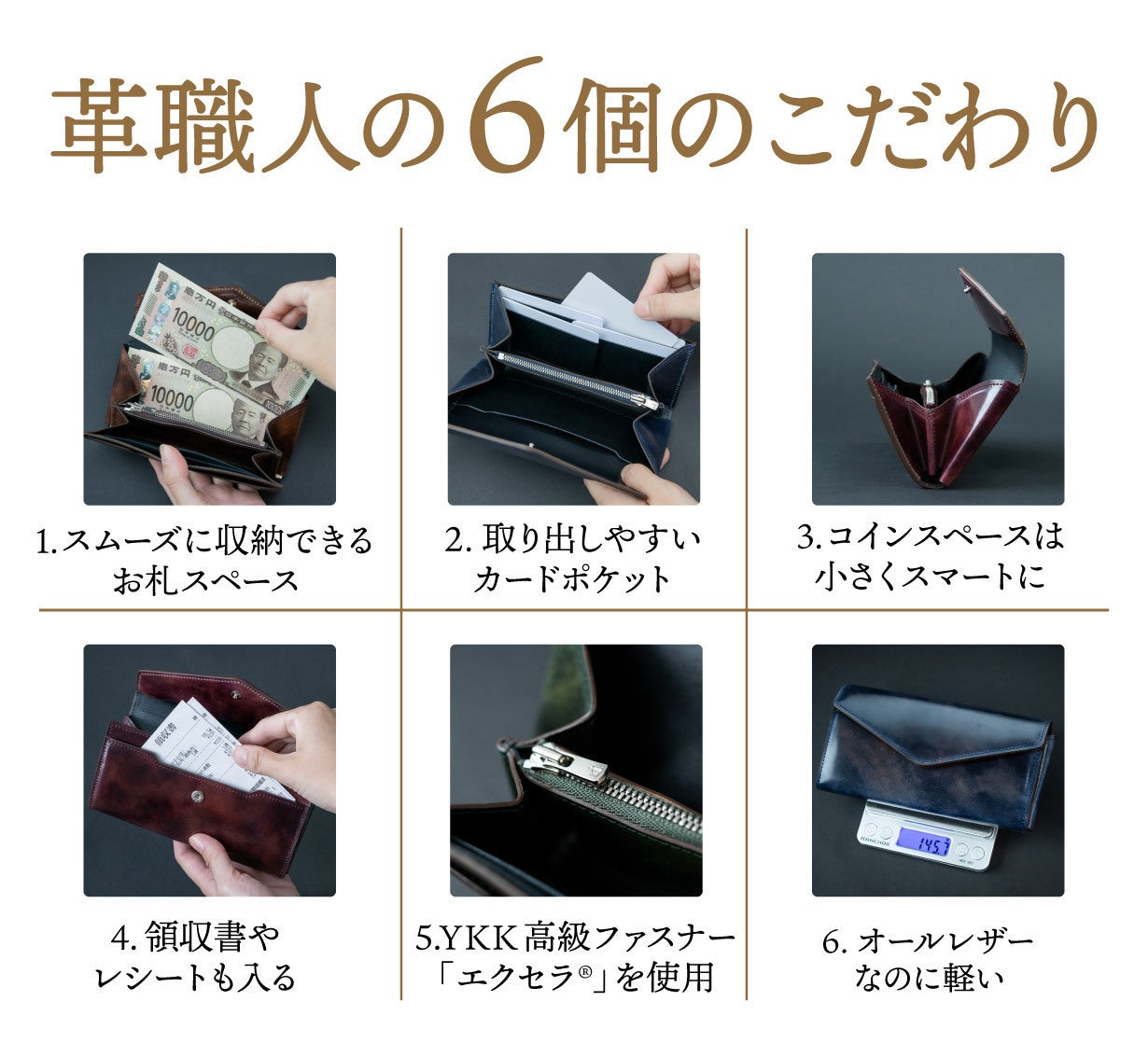 「極小長財布Ficelle-フィセル-」はオールレザーの長財布なのに、不必要なパーツを取り除くことにより、なんと「約145g」と、とても軽い財布にすることができました。