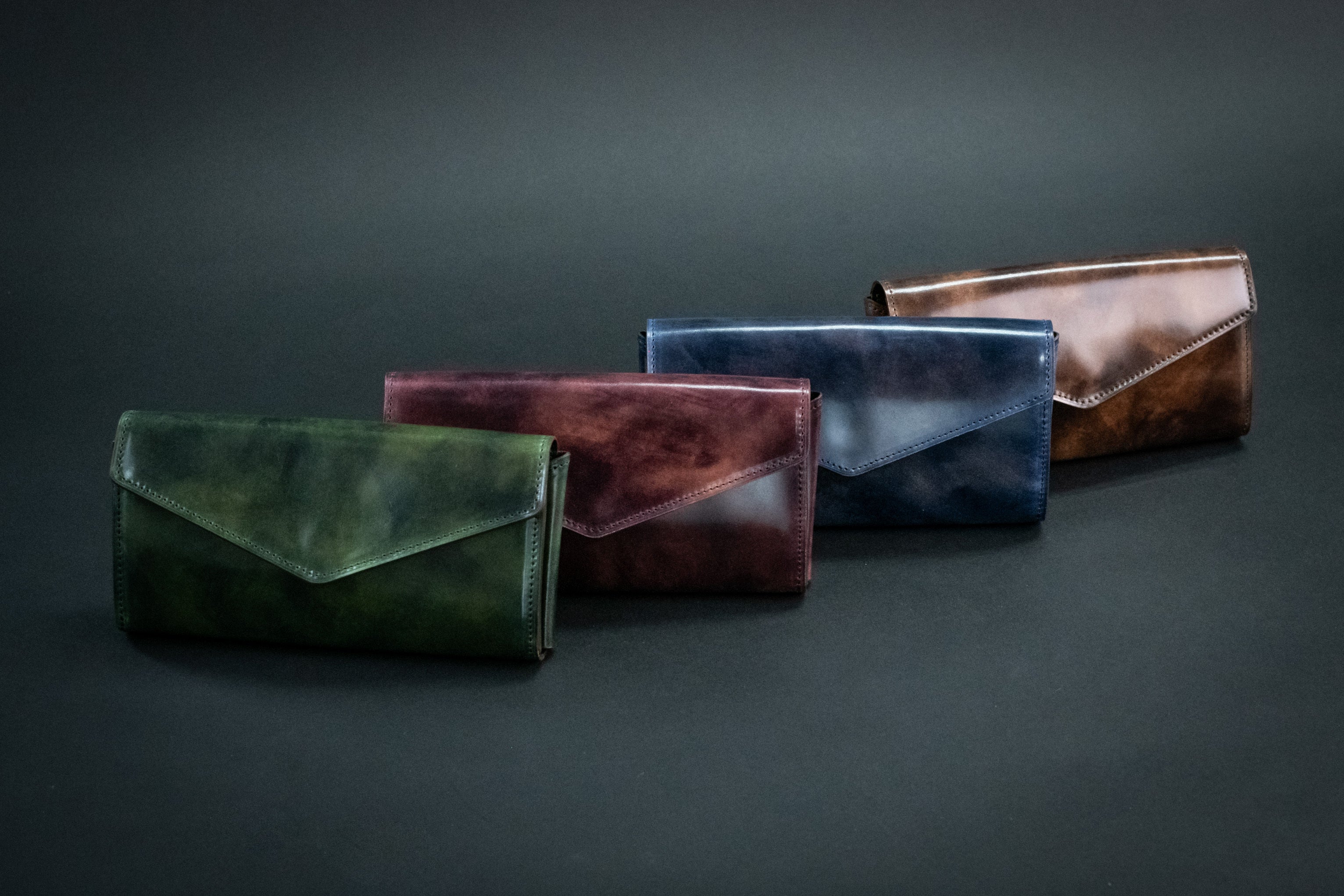 左から グリーン・バーガンディ・ネイビー・ブラウンとなります。
