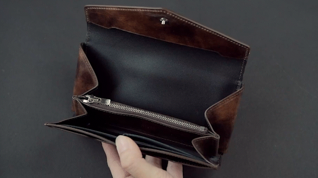 「キャッシュレス時代の極小長財布」をテーマに、数多くの「フラップ長財布」を作った実績のある財布職人の私たちが試行錯誤を重ねて、ようやく辿りついた「もうこれ以上小さくするのは無理!!」と音をあげた、極小のフラップ長財布です。
