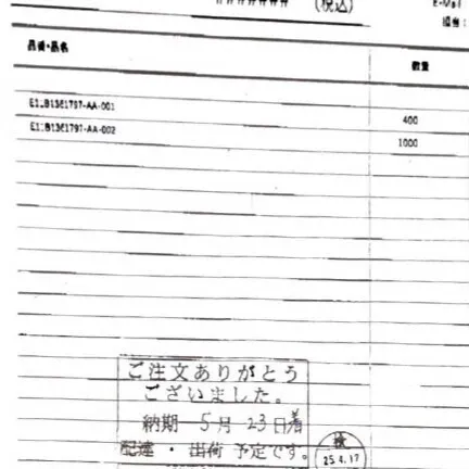 本投稿には、被膜加工会社様からいただいた納期確定のFAX文書の写しを添付しております。少しでもご安心いただければ幸いです。