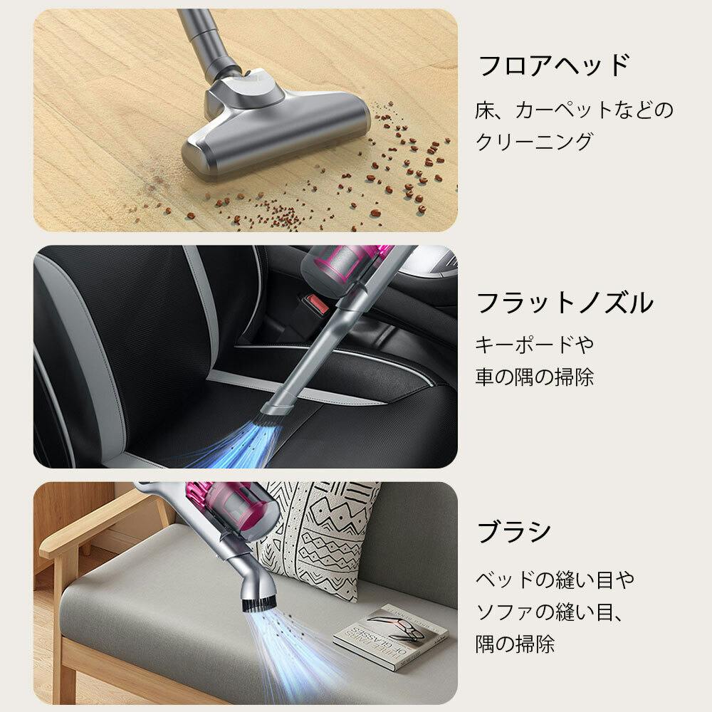 この掃除機には、豊富なアタッチメントが付属しており、床用ノズル、隙間ノズル、ブラシ付きノズル、延長パイプ、ソファ用ノズルなど、様々な清掃シーンに対応します。90°から180°まで調整可能な清掃角度により、あらゆる場所の清掃が簡単です。また、スティッククリーナーとしてもハンディクリーナーとしても使用可能な4WAY仕様で、使用場所に応じて最適な使い方が選べます。家庭やオフィス、車内など、どんな場所でも快適に使えるデザインで、清掃作業を楽に行えるのが特徴です。これらの多機能アタッチメントを使って、隅々まできれいにしましょう。