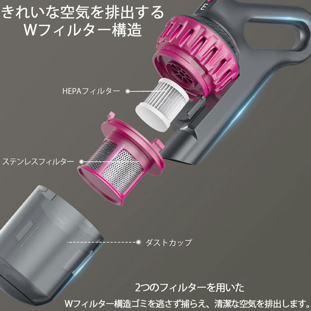この掃除機は、2000mAh*3の大容量バッテリーを搭載しており、最大で30分の連続使用が可能です。一度の充電で家全体の掃除が完了するため、充電時間を気にせず使用できます。さらに、低騒音設計により、早朝や深夜でも周囲に迷惑をかけることなく、静かに掃除が行えます。パワフルながら静かな運転音は、日常の騒音ストレスを軽減し、家族や隣人を気にせず快適に使用できるのが魅力です。多重フィルターシステムが微細なホコリやアレルゲンを確実に捉え、清潔な空気を排出します。