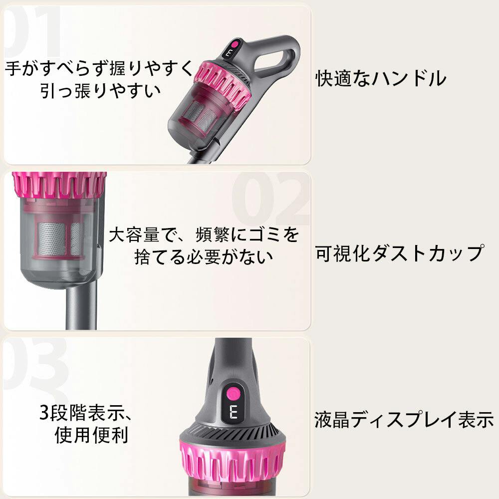 【驚きの軽量設計で快適に使える】このスティッククリーナーは、わずか0.6kgの軽量設計で、片手でも楽に操作できます。その軽さは長時間の使用でも疲れを感じにくく、階段や高い場所の掃除も容易にこなせます。軽量かつコンパクトなので、持ち運びも簡単で、家の中だけでなく車内の清掃にもぴったりです。また、収納スペースを有効活用できるコンパクト設計により、場所を取らずに保管できます。家庭用だけでなく、オフィスでも便利に使えるデザインで、どんな場所でも快適に使えます。これ一台で、家全体を清潔に保ちましょう。