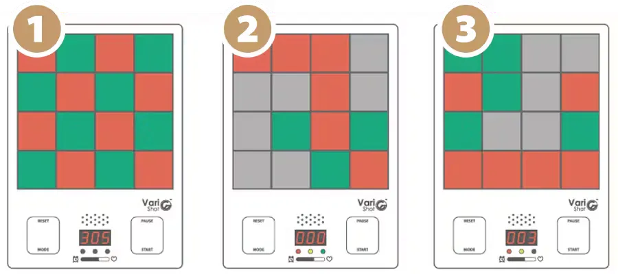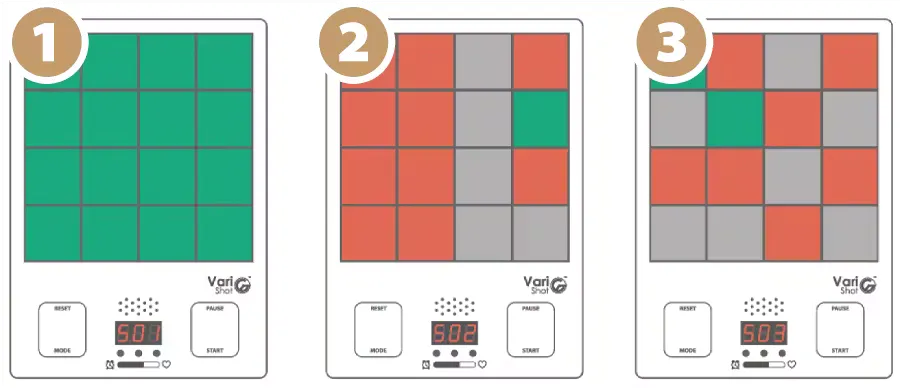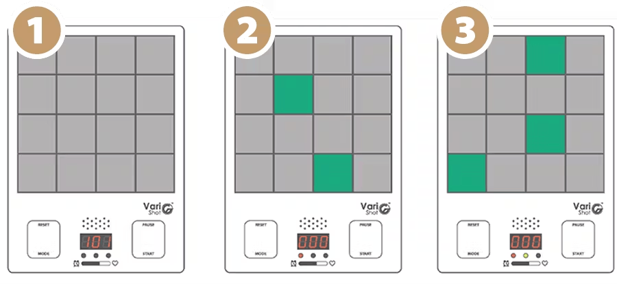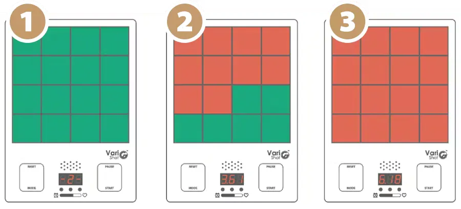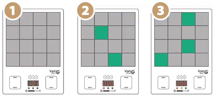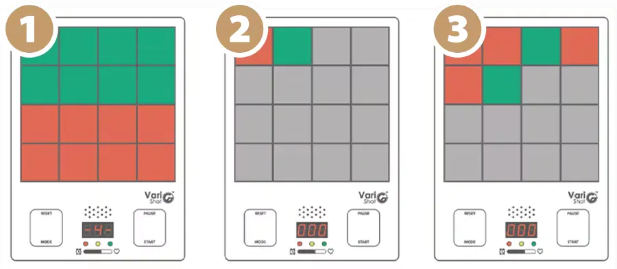 A. はじめはVariShotから2m以内でプレーすることをお勧めします。もっとチャレンジしたい方は10mまで離れてプレーすることが可能です。※VariShotとLaserGunの間に障害物があると、精度に影響を与える可能性があるのでご注意下さい。