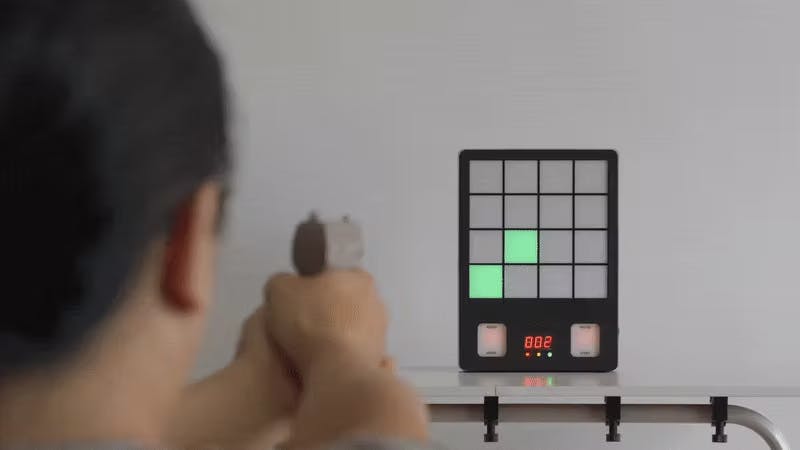 ランダムに光るブロックから緑のみを狙撃。赤を撃ったら減点!!時間内でどれだけのポイントを獲得できるか挑戦!