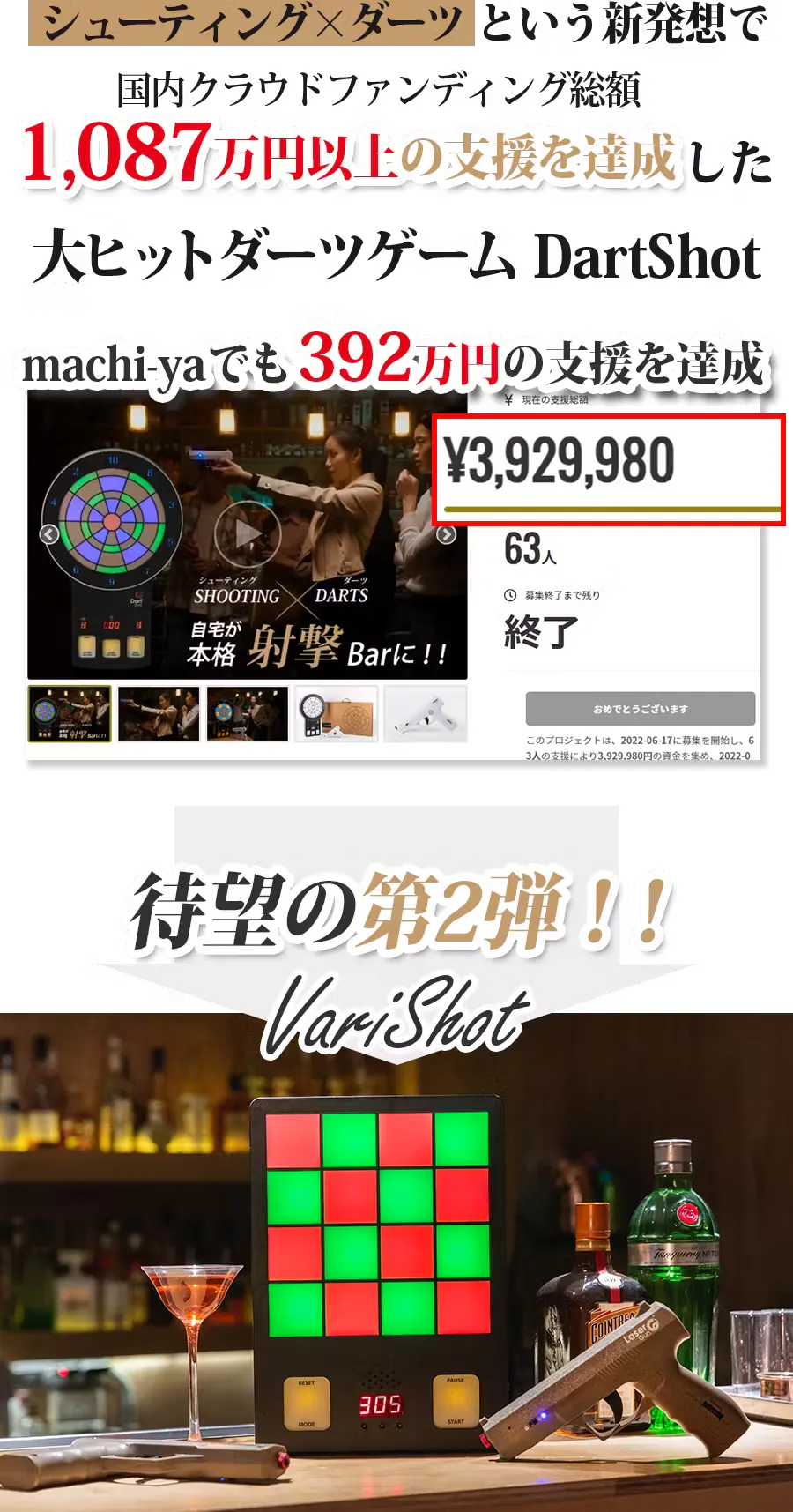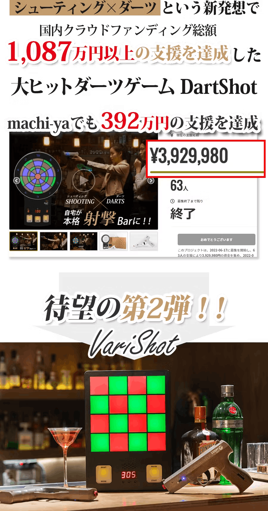 そして、レーザーガン及び照準器の製造経験と高精度な射撃技術を組み合わせ、2022年に、machi-yaでDartShot https://camp-fire.jp/projects/view/571018 をローンチしました。そして今回第2弾となるVariShotを完成できとても喜んでいます。