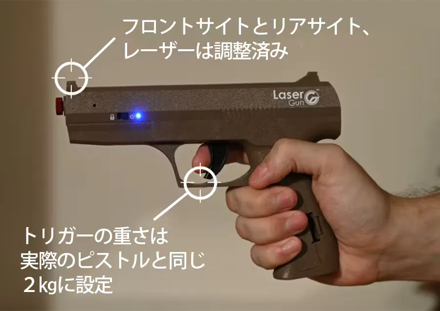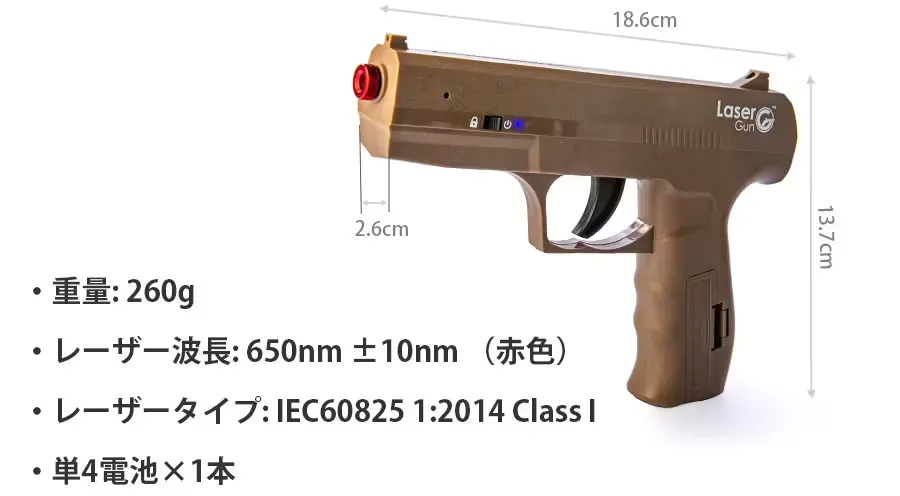 A. LaserGunで採用されたレーザーは基準がクラス1に分類されたレーザー光です。日本ではレーザーの基準がクラス1からクラス4まで有り、クラス1はその中で1番下のクラス、DVD プレイヤー等にも使われるレーザー光です。しかしレーザー光の直視は避け、人には向けないでください。