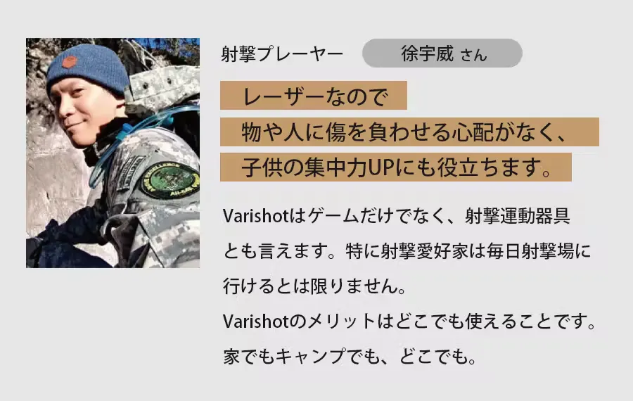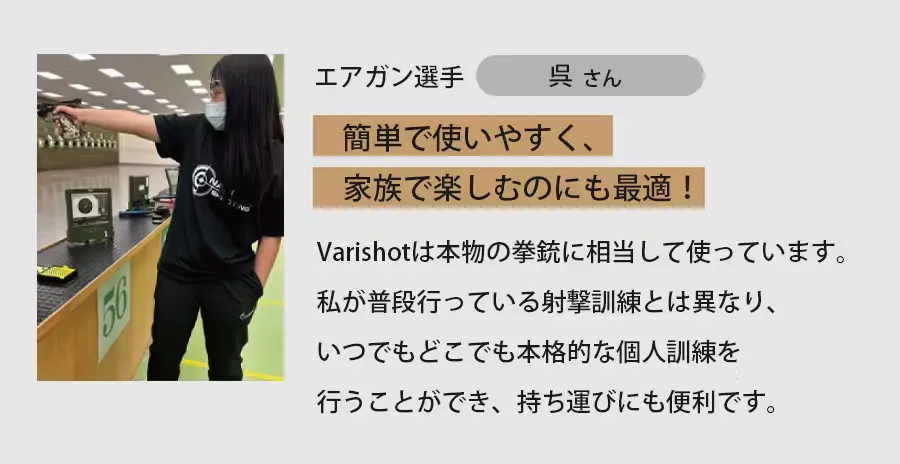 また、精度、スピード、スタンス/フォームの向上に適応させるため、さまざまな射撃トレーニング方法や競技ルールも熟考しVariShotが生まれました。誇れるクオリティのアイテムです。