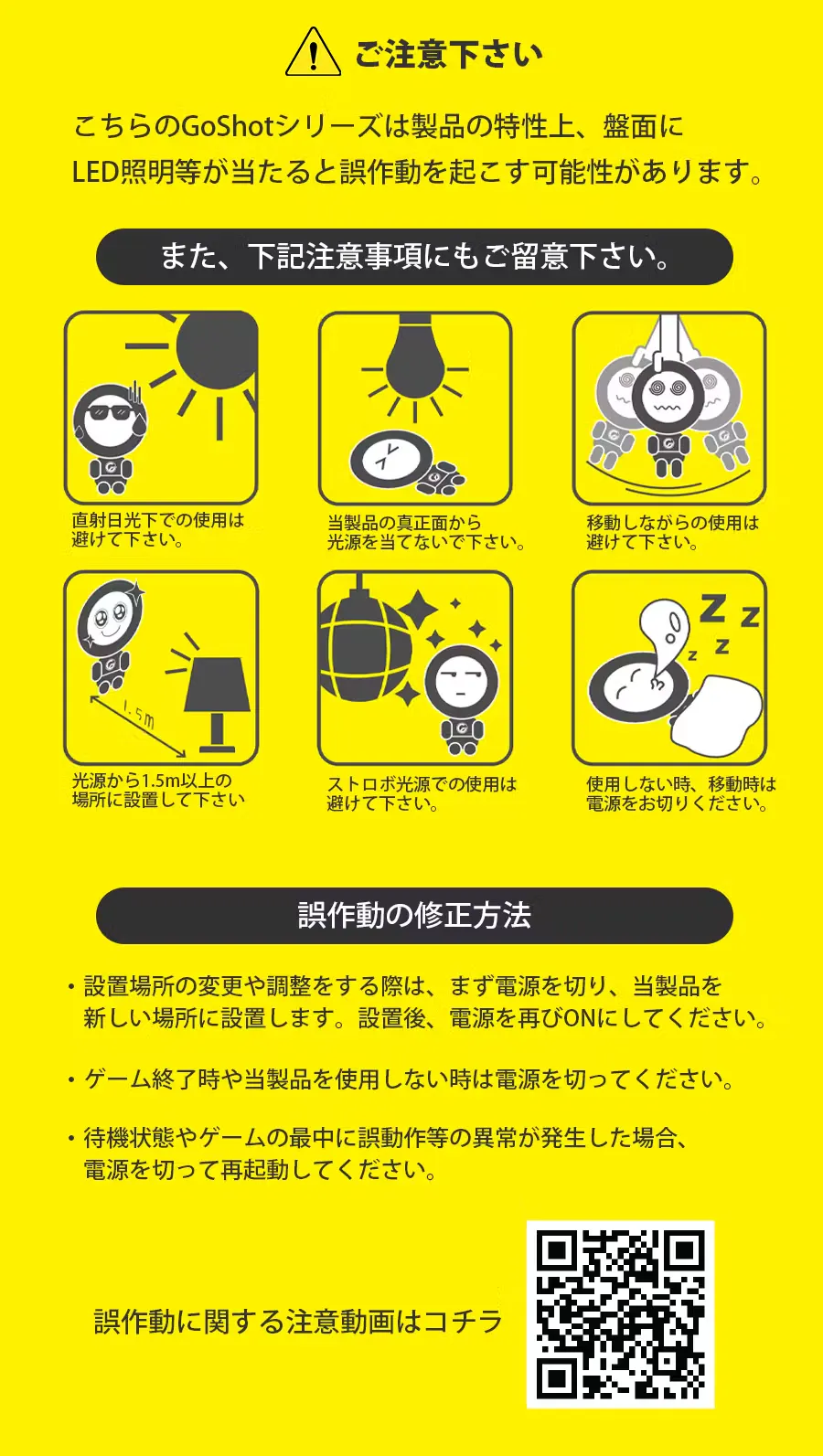 A. LED照明などが直接VariShotの盤面に当たると誤作動する場合があります。その場合は盤面に直接LED照明などが当たらないように、置き場所を調整してみてください。なるべく暗い環境の方がイルミネーションをよりはっきりと視認できますので、暗い環境でのご使用をお勧めします。
