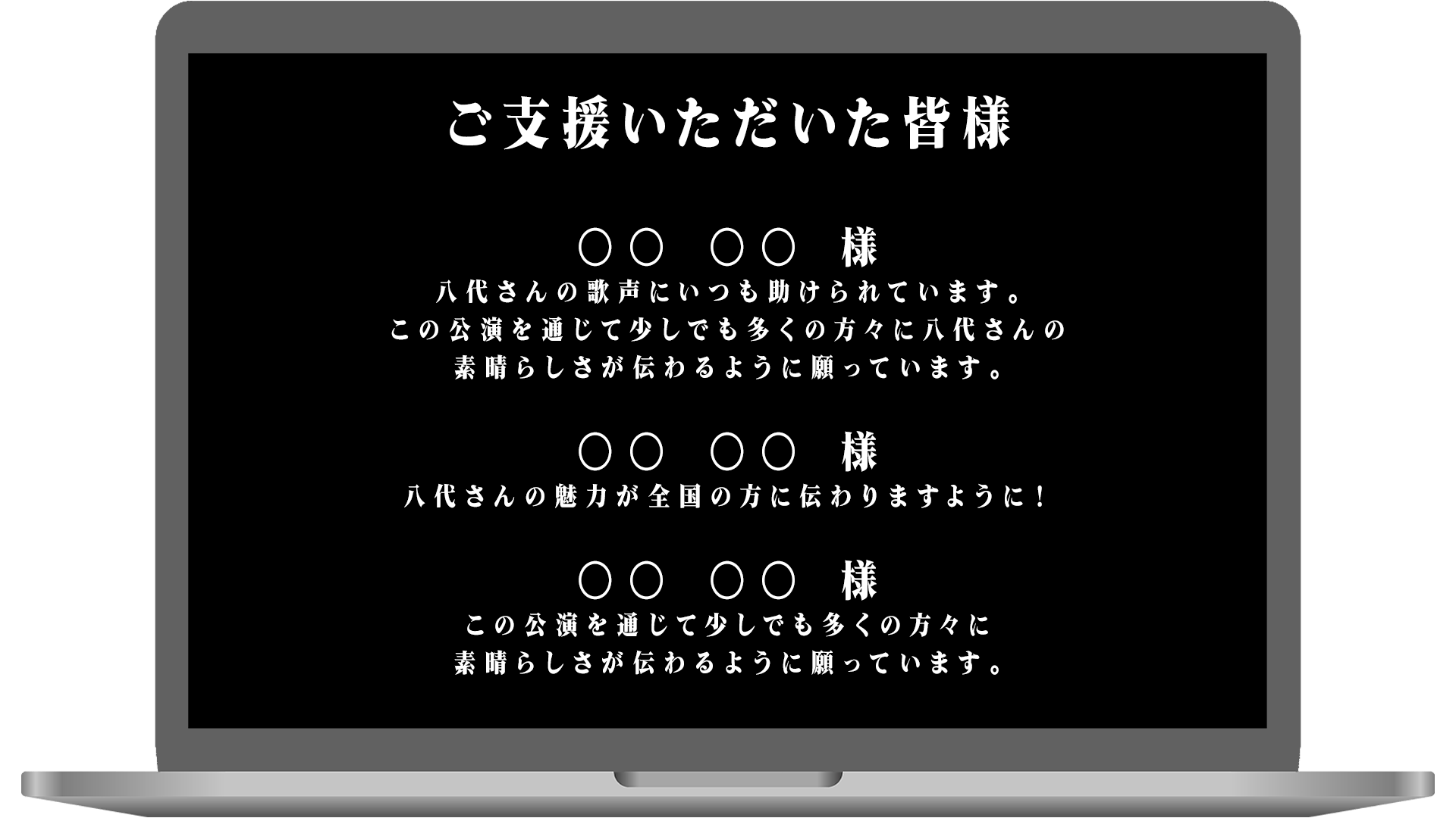 DVD orブルーレイの映像のエンドロール等、映像の中に八代さんへの一言メッセージを挿入させていただきます。あなたの八代さんに対する想いを八代さんの作品の中に入れることができます。(最大100字まで)