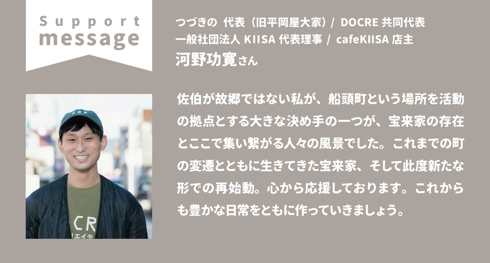 今日の応援メッセージは、宝来家のある船頭町に移住し、このまちの賑わいを取り戻してくれた立役者の方からです。