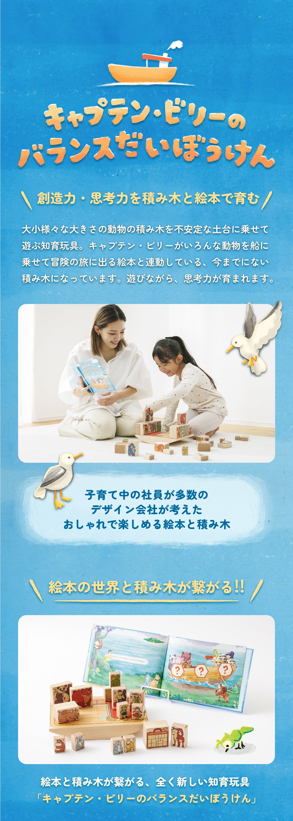 【超早割】キャプテン・ビリーのバランスだいぼうけん 以下のセットをお送りさせていただきます。 ・キャプテン・ビリーのバランスだいぼうけん積み木1セット ・絵本「キャプテン・ビリーのバランスだいぼうけん」1冊 先着200名様限定で販売予定価格27,500円の20%OFFの22,000円でご提供させていただきます。 ※送料込みのお値段です。 お申し込み順に発送いたします。 ※皆様のご支援により量産効率が向上した場合、正規販売価格が販売予定価格より下がる可能性もございます。 ※デザイン・仕様・内容品は変更になる可能性もございます。ご了承ください。 ※ご注文状況、使用部材の供給状況、製造工程上の都合等により出荷時期が遅れる場合があります。 ※適格請求書発行事業者登録番号:あり(番号が必要な方はメッセージで問い合わせください)