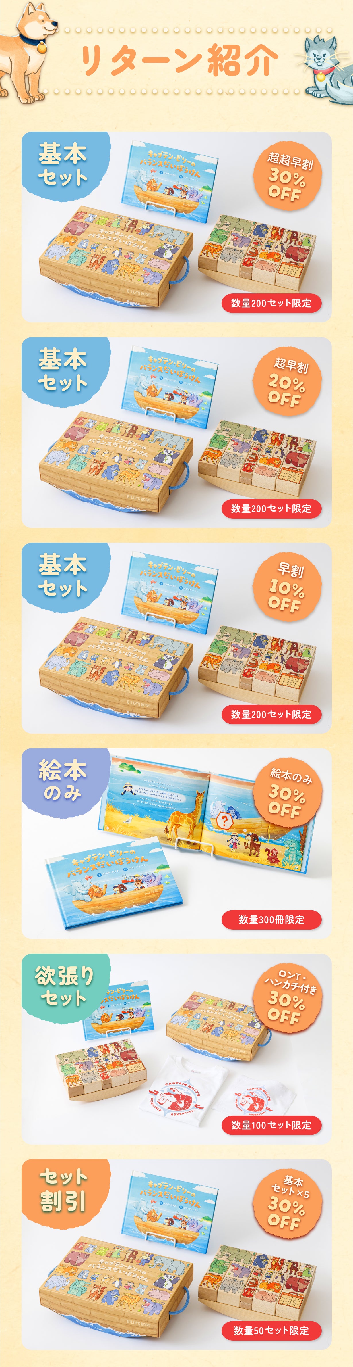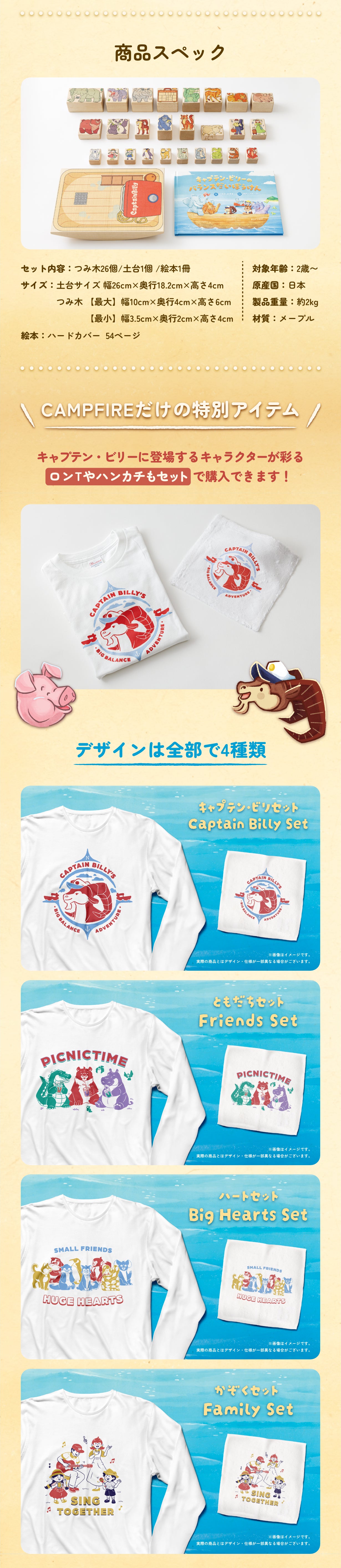 【欲張りセット】キャプテン・ビリーのバランスだいぼうけん 以下のセットをお送りさせていただきます。 ・キャプテン・ビリーのバランスだいぼうけん積み木1セット ・絵本「キャプテン・ビリーのバランスだいぼうけん」1冊 ・キャプテン・ビリーのバランスだいぼうけんロングTシャツ(130サイズ、110サイズより選択できます) ・キャプテン・ビリーのバランスだいぼうけんハンカチ(サイズ20cm×20cm) Tシャツとハンカチのデザインを以下の4つから選択できます。 (キャプテンビリーセット・ともだちセット・ハートセット・かぞくセット) 先着100名様限定で販売予定価格33,000円の30%OFFの23,100円でご提供させていただきます。 ※送料込みのお値段です。 お申し込み順に発送いたします。 ※皆様のご支援により量産効率が向上した場合、正規販売価格が販売予定価格より下がる可能性もございます。 ※デザイン・仕様・内容品は変更になる可能性もございます。ご了承ください。 ※ご注文状況、使用部材の供給状況、製造工程上の都合等により出荷時期が遅れる場合があります。 ※適格請求書発行事業者登録番号:あり(番号が必要な方はメッセージで問い合わせください)