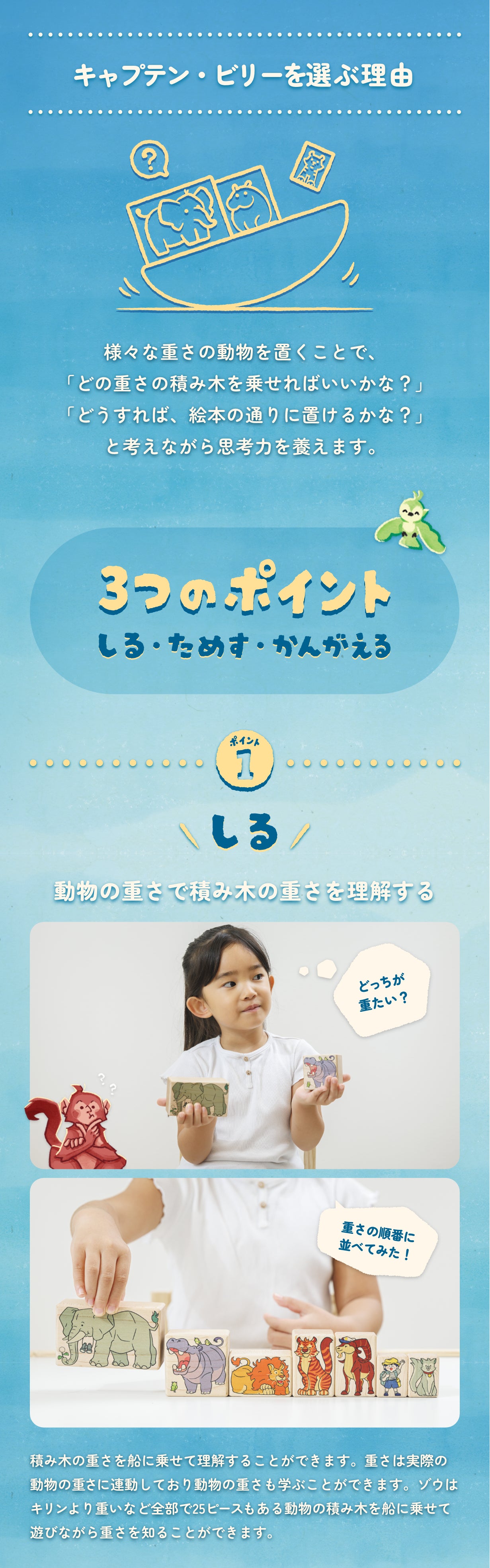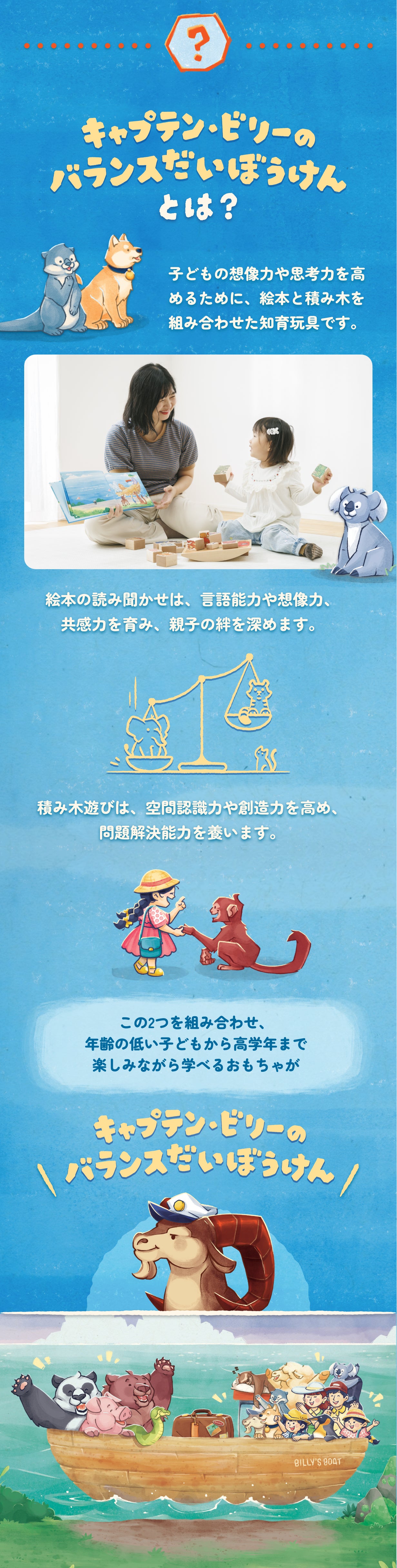 【超超早割】キャプテン・ビリーのバランスだいぼうけん 以下のセットをお送りさせていただきます。 ・キャプテン・ビリーのバランスだいぼうけん積み木1セット ・絵本「キャプテン・ビリーのバランスだいぼうけん」1冊 先着200名様限定で販売予定価格28,300円の30%OFFの19,800円でご提供させていただきます。 ※送料込みのお値段です。 お申し込み順に発送いたします。 ※皆様のご支援により量産効率が向上した場合、正規販売価格が販売予定価格より下がる可能性もございます。 ※デザイン・仕様・内容品は変更になる可能性もございます。ご了承ください。 ※ご注文状況、使用部材の供給状況、製造工程上の都合等により出荷時期が遅れる場合があります。 ※適格請求書発行事業者登録番号:あり(番号が必要な方はメッセージで問い合わせください)