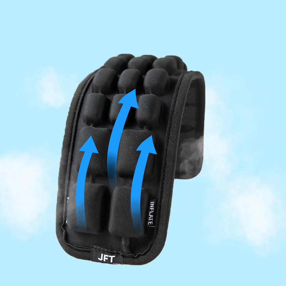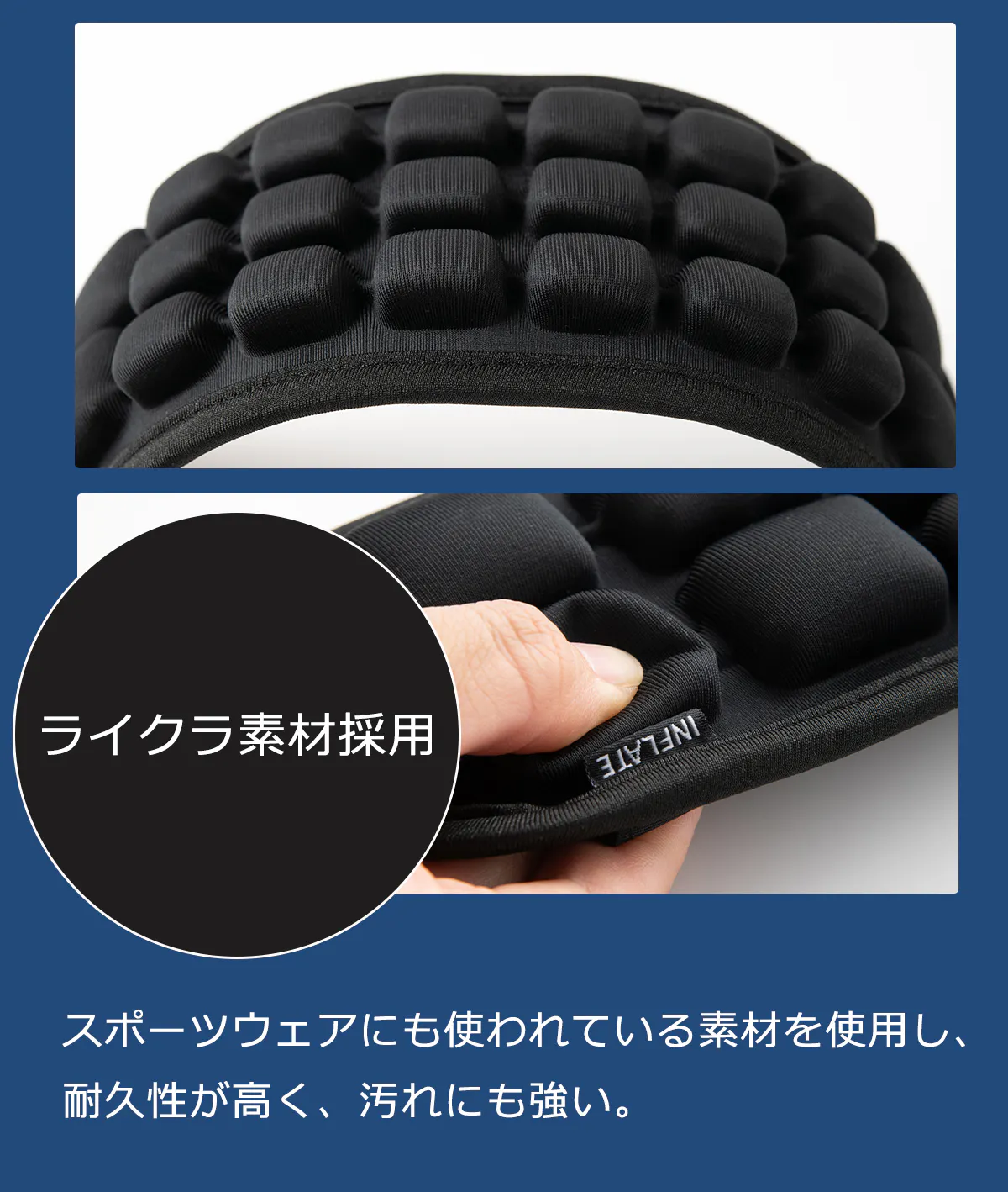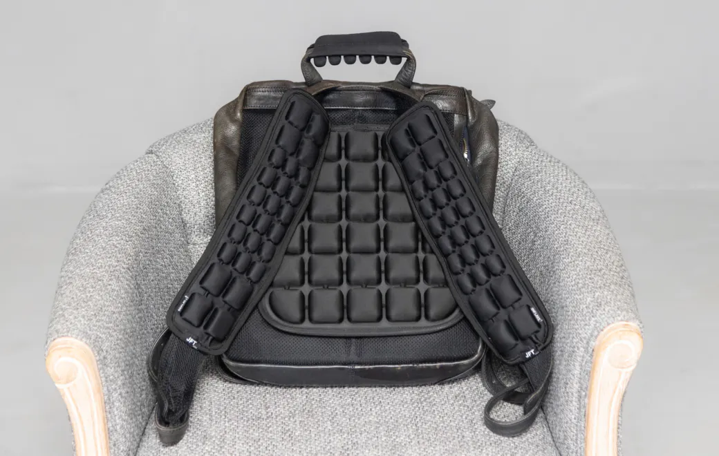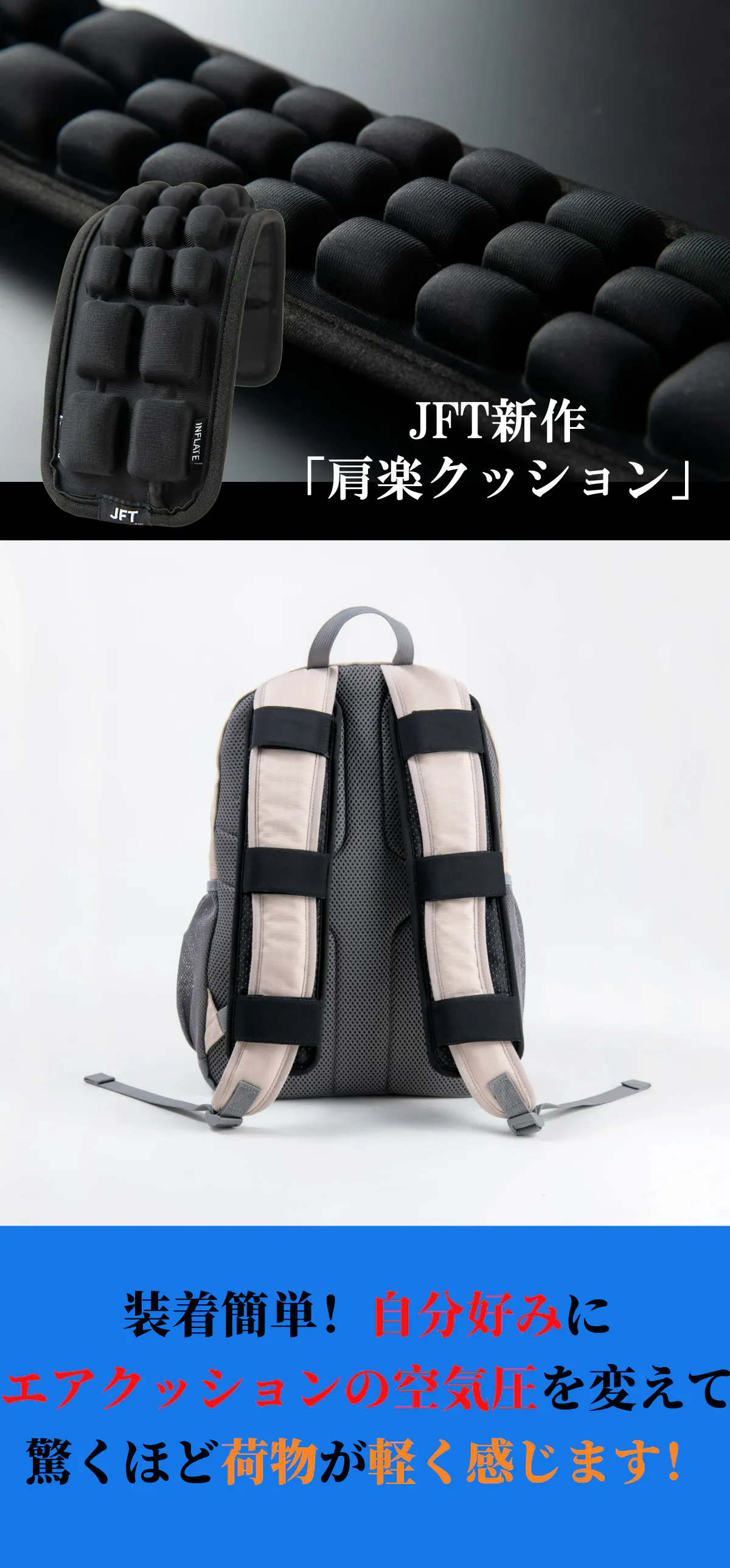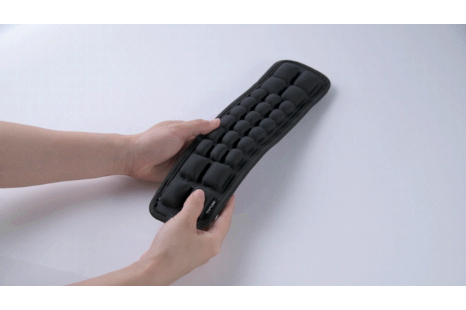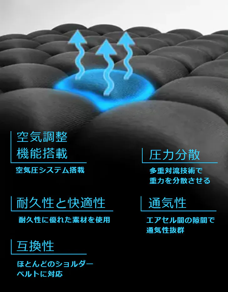 押すだけでいつでもどこでも簡単に空気の量を調整できます。好みに合わせたサポートが可能で、肩の負担を大幅に軽減します。