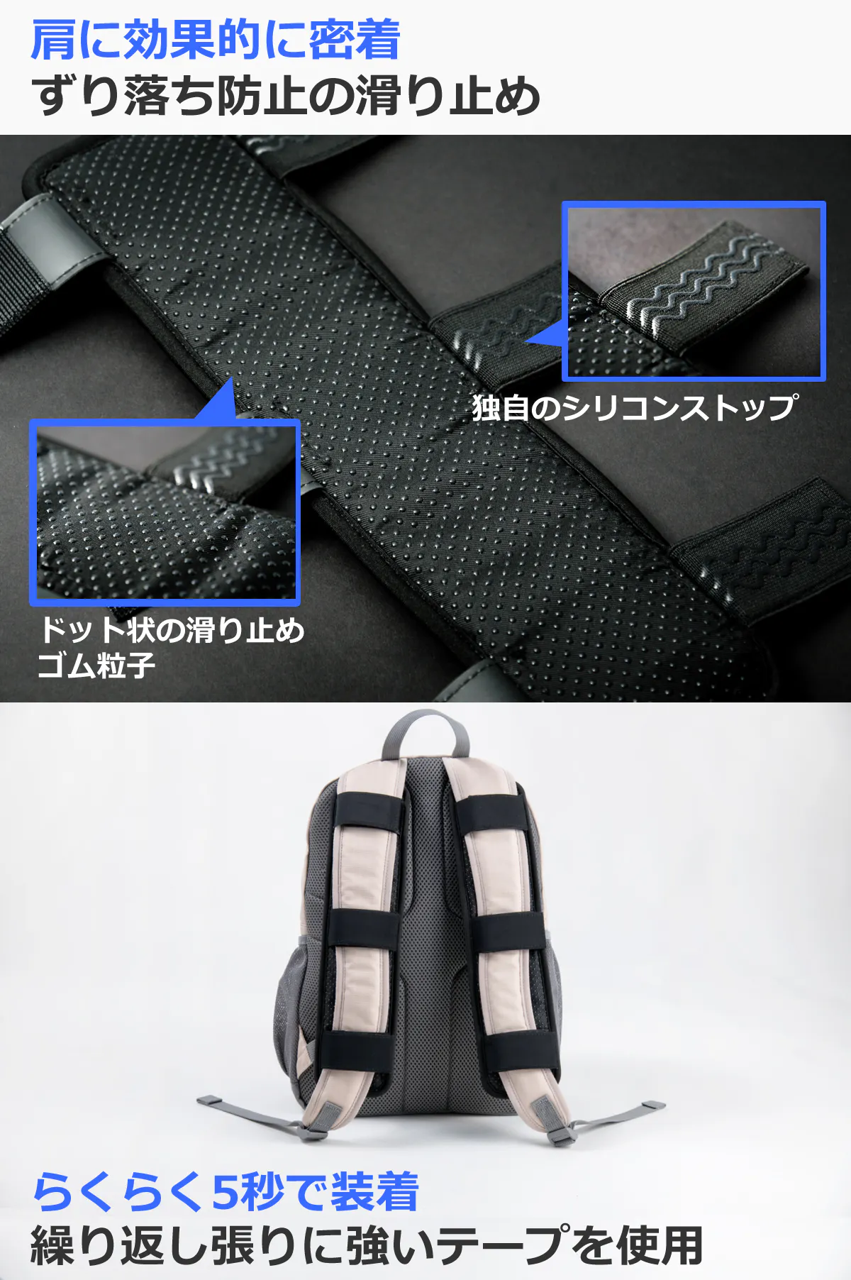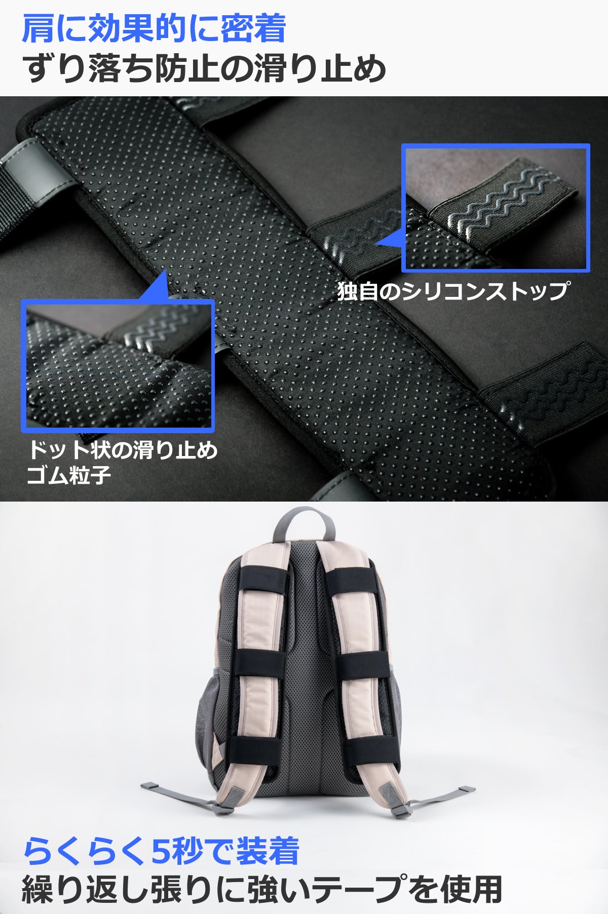 付属している丸テープをリュック側に貼るだけで、バックエアクッションが装着可能です。