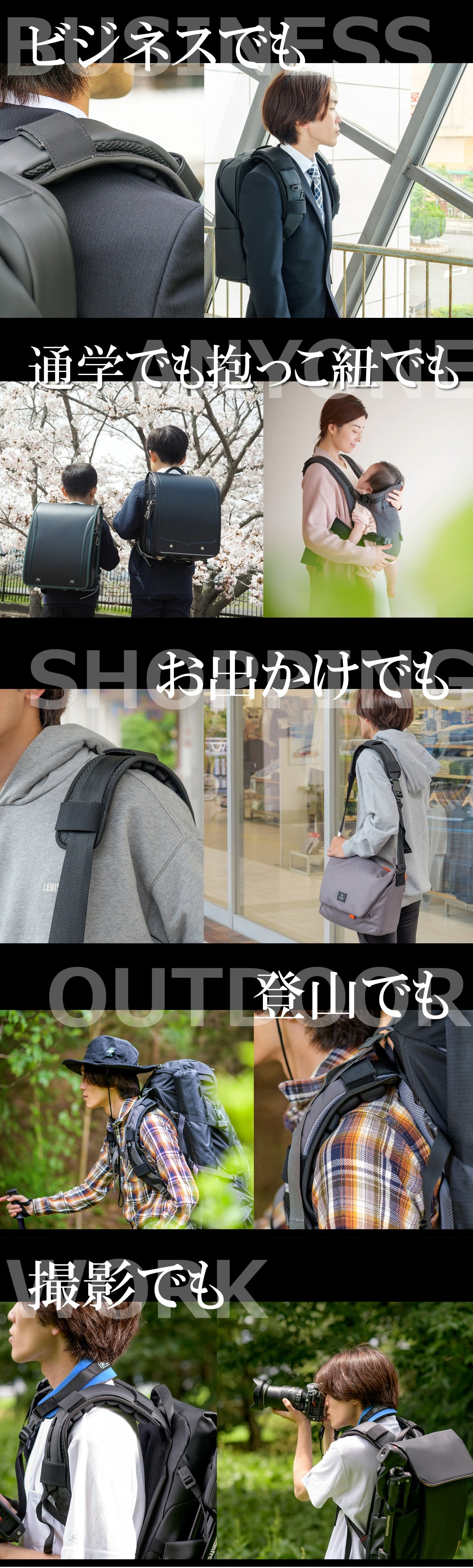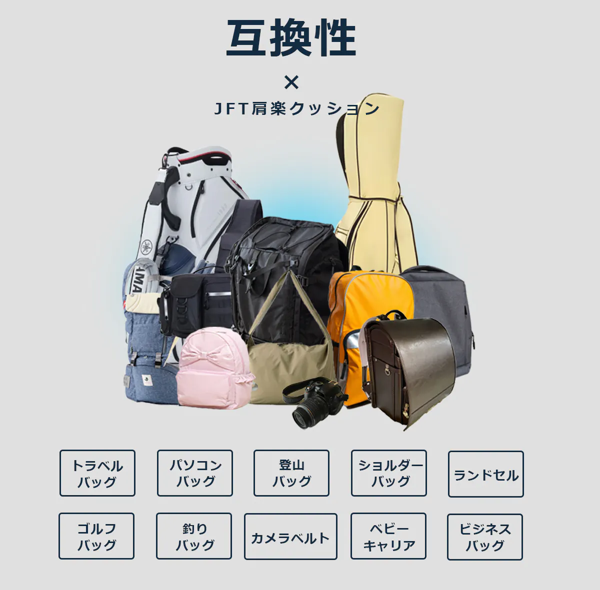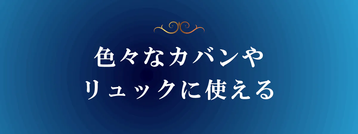 ランドセル、リュックサック、登山用バッグ、カメラバッグ、PCバッグ、ビジネスバッグ、斜め掛けバック、クーラーボックス、アウトドアバッグ、ゴルフバッグ、カメラバッグ等様々なタイプに取り付け可能です。