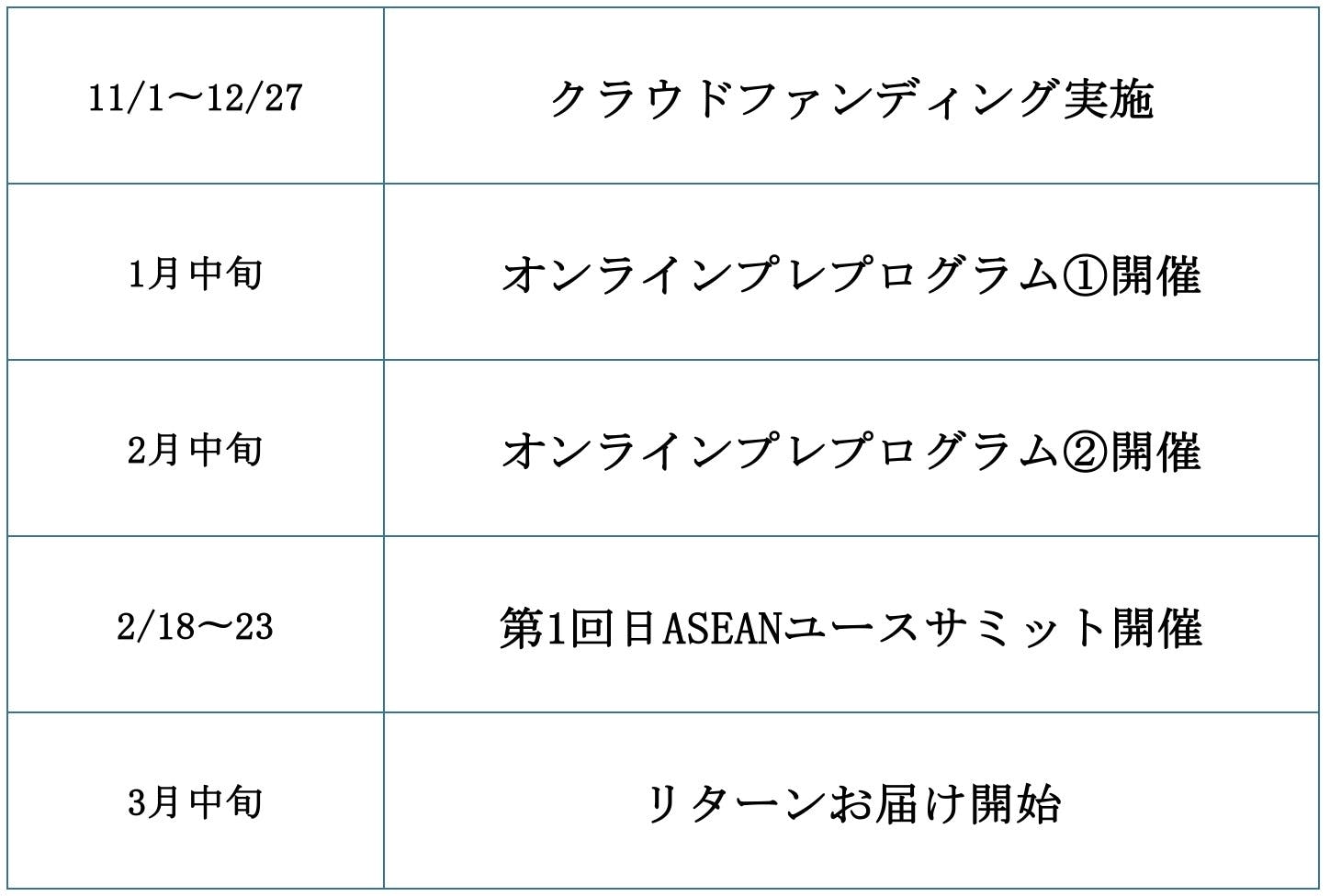 このプロジェクトの開催期間とクラウドファンディングの実施期間に関して、以下の表にまとめました。みなさまからのご支援お待ちしております!