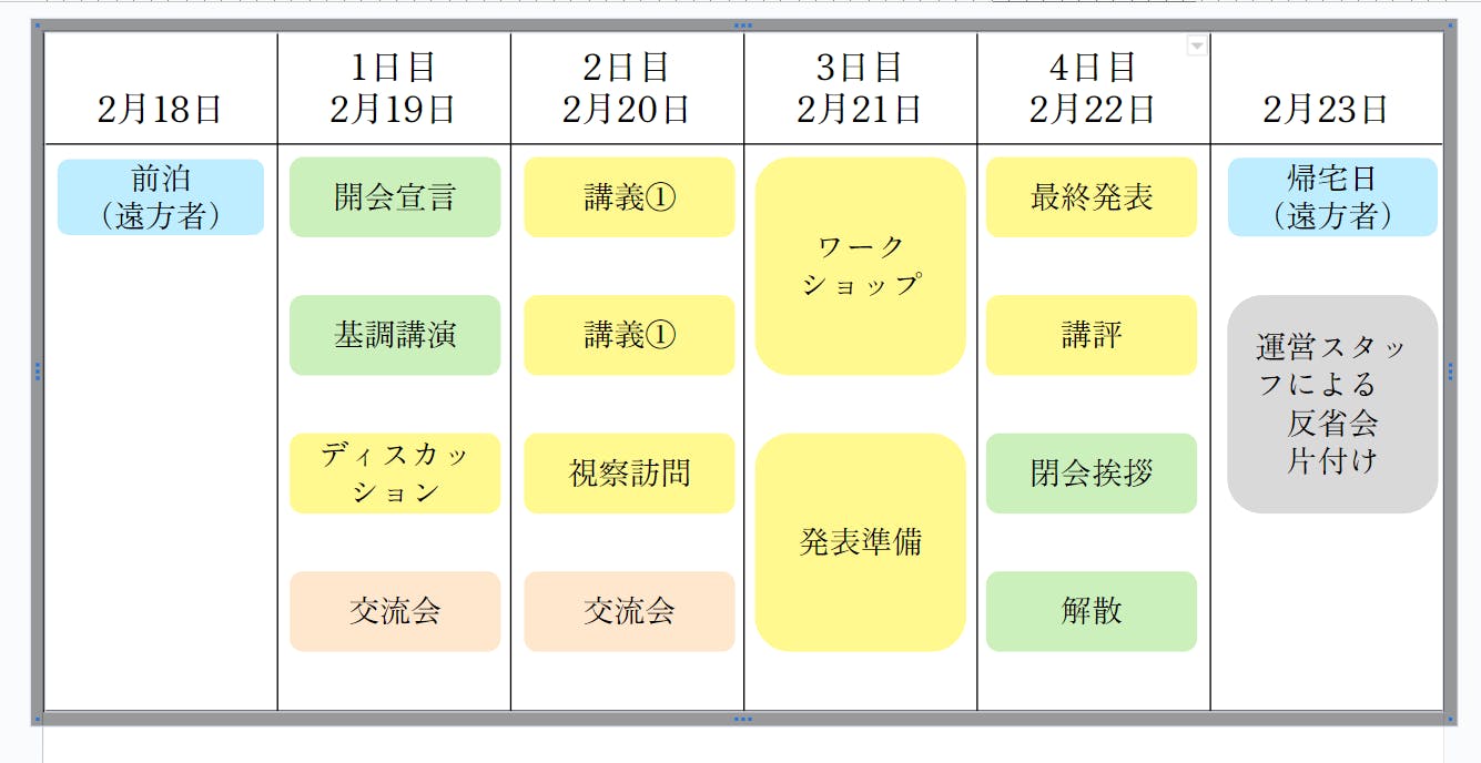 全体プログラムとして、開会式、交流会、最終発表会、閉会式を行い、それ以外は、参加者が2つの分科会に分かれて、各分科会のプログラムに参加してもらう形式をとっています。会議の全体像は以下の表のとおりです。