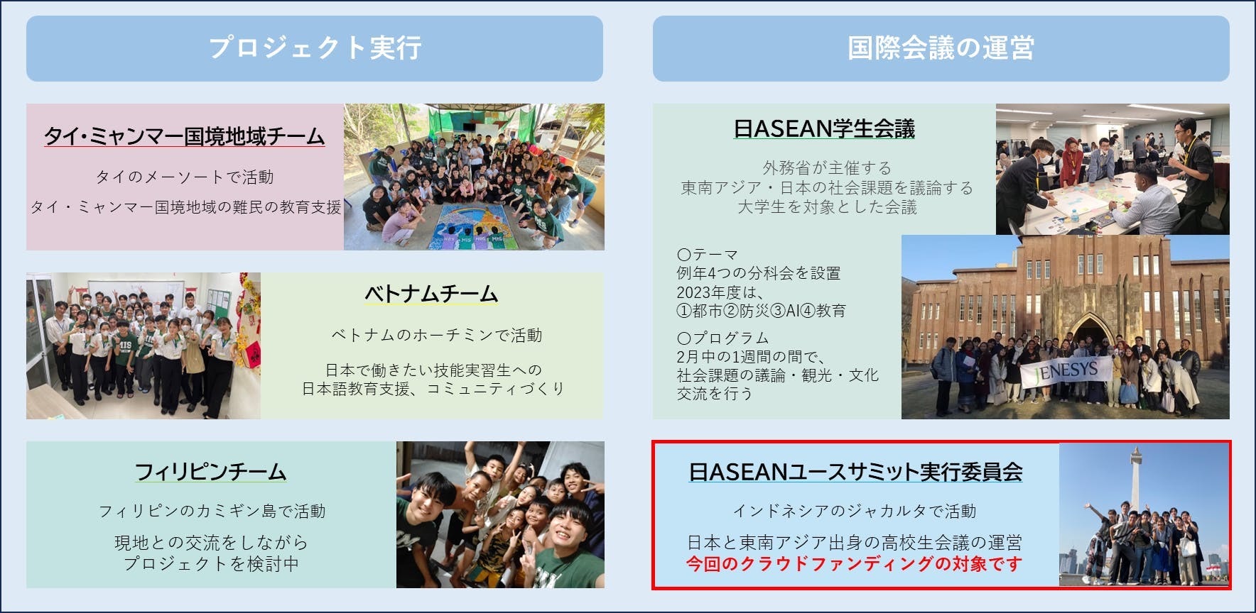 2023年に日本と東南アジアは、友好協力50周年を迎え、政治・経済だけでなく、社会・文化の面における交流もこれからますます発展していくことが期待されています。私たちも、日本と東南アジアの交流をもっと増やそうと日々活動をしています。この「日ASEAN友好協力50周年」を記念して、複数のプロジェクトが始動しました。その一つが「日ASEANユースサミット」です。