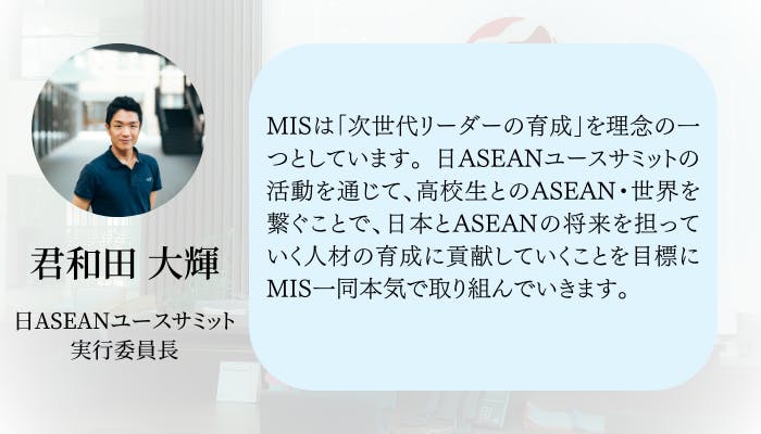 両者に共通することは、このプロジェクトのような学生の国際会議を通して、海外の学生と交流し、最前線で働く専門家や研究者などと意見を交わし、実際に現場を見てみるという非日常的な経験は、高校生たちの将来に大きな影響を与えるはずだという確信を持っているところです。高校生という早い段階から、国際的な社会問題に関心を持ち、自身のキャリアを考え、成長することは、いずれ高校生自身だけでなく、将来的に東アジア全体、世界全体の発展に寄与します。私たちは、非日常的な経験を高校生に体験してもらうことを通じて、次世代のリーダーを育成し、将来的に国際社会に寄与する、そのために、『日ASEANユースサミット2024』の開催を目指しています。