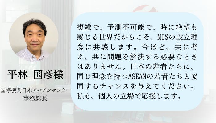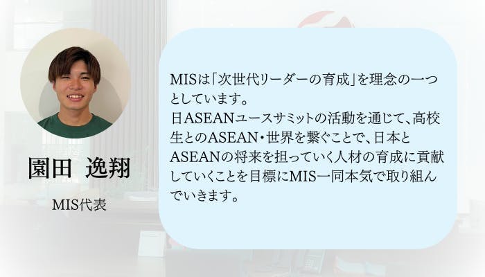NPO法人MISは、日本と東南アジアのユース世代との交流や社会問題に関する議論を通じて、社会課題の解決するプロジェクトを立ち上げ、日本と東南アジアの社会発展に寄与するため、「日ASEANユースサミット」以外の活動も複数行っています。もし興味がある方がいらっしゃいましたら、活動内容やホームページ、SNSアカウントを参照又はフォローしていただけると幸いです。