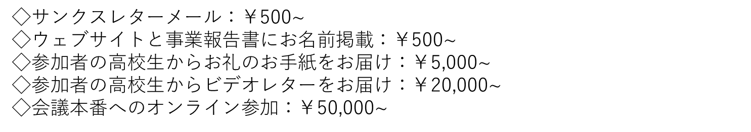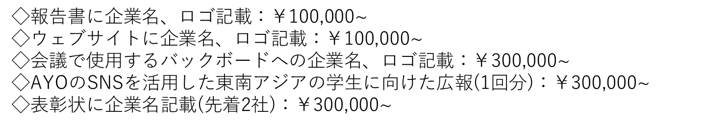 ※50万円以上の支援を下さる企業は、本事業以外での東大生とのコラボレーション事業の企画や来年度開催でのタイアップ等を考えておりますので、相談させていただきたいです。以下のメールアドレスにお問い合わせください。