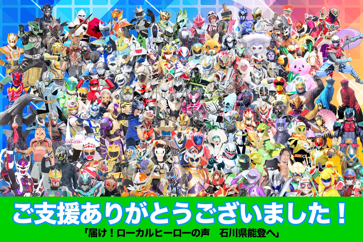 そこで、私ども日本ローカルヒーロー祭実行委員会は、今後もこの震災が忘れ去れることの無いよう千葉県蘇我で開催される、日本ローカルヒーロー祭にお集まり頂くお客様、そして全国から集結するローカルヒーロー達と共に【届け!ローカルヒーローの声!石川県能登へ!】をスローガンに、クラウドファンディング・キャンプファイアを実施し、集められた支援額の一部を石川県能登半島にNPO団体様を通し、義援金としてお送り出来ればとの思いを込めプロジェクトを立ち上げさせて頂きました。