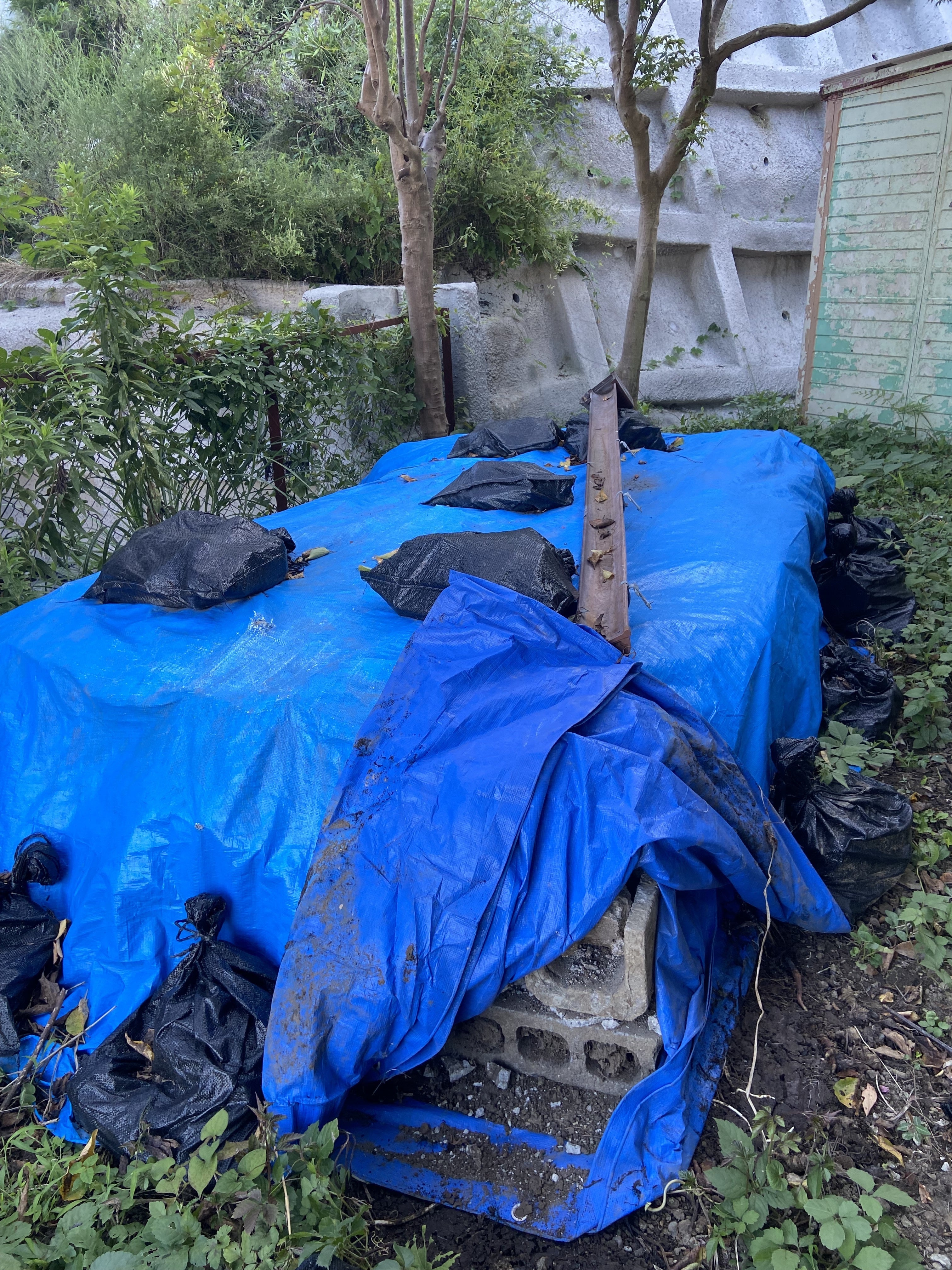 ブルーシートで覆っていますが瓦礫が積まれています・・・