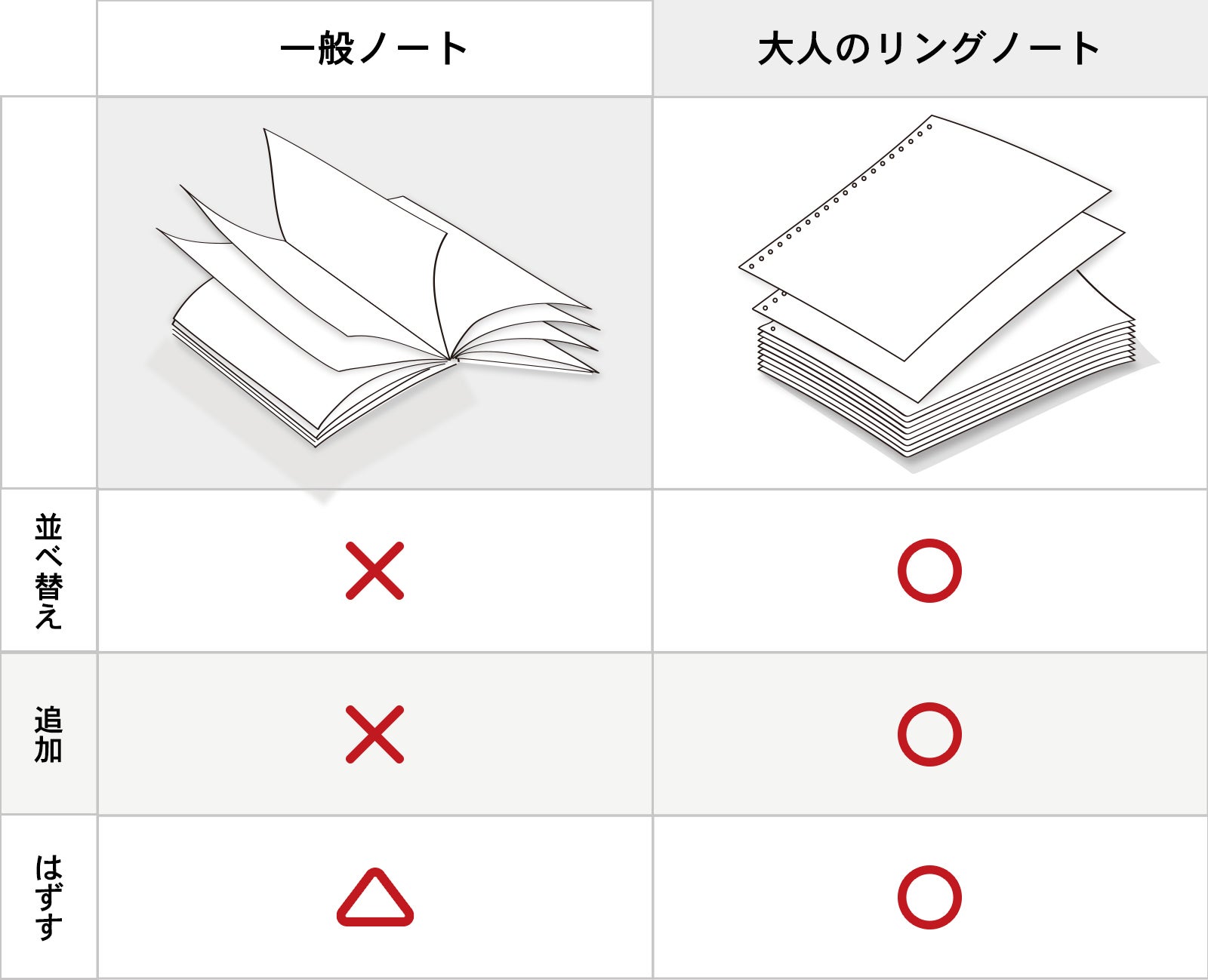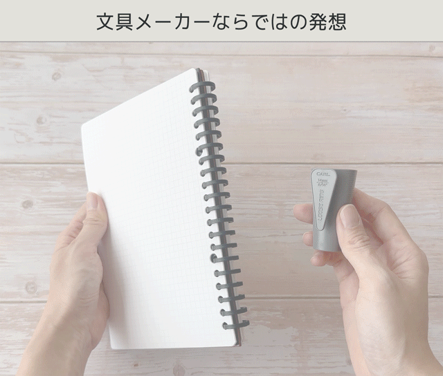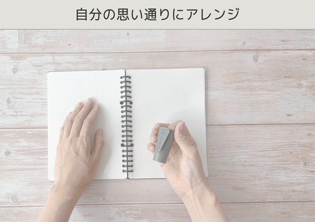 そのため、大人のリングノートは開閉できるルーズリングを採用し、従来のノートが実現できない「ページ編集」を自分で手早く・きれいに製本できます。