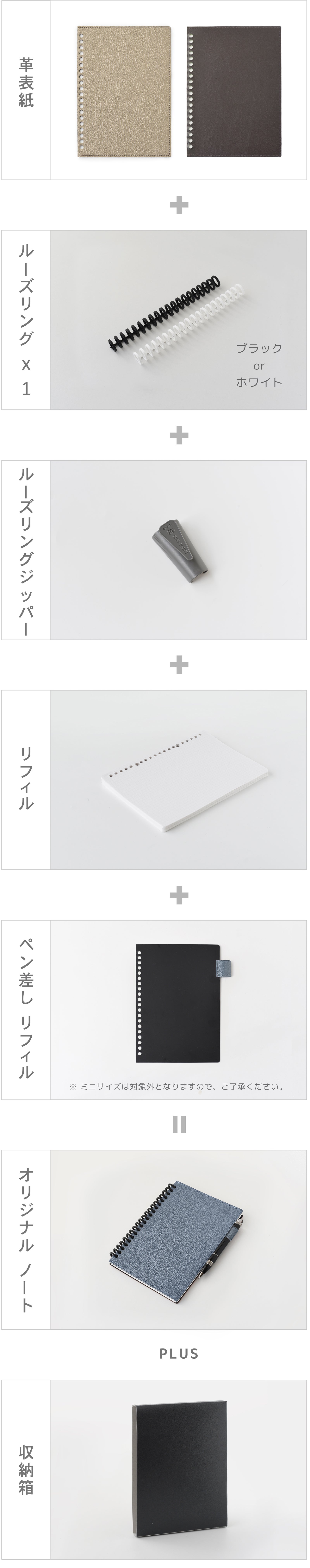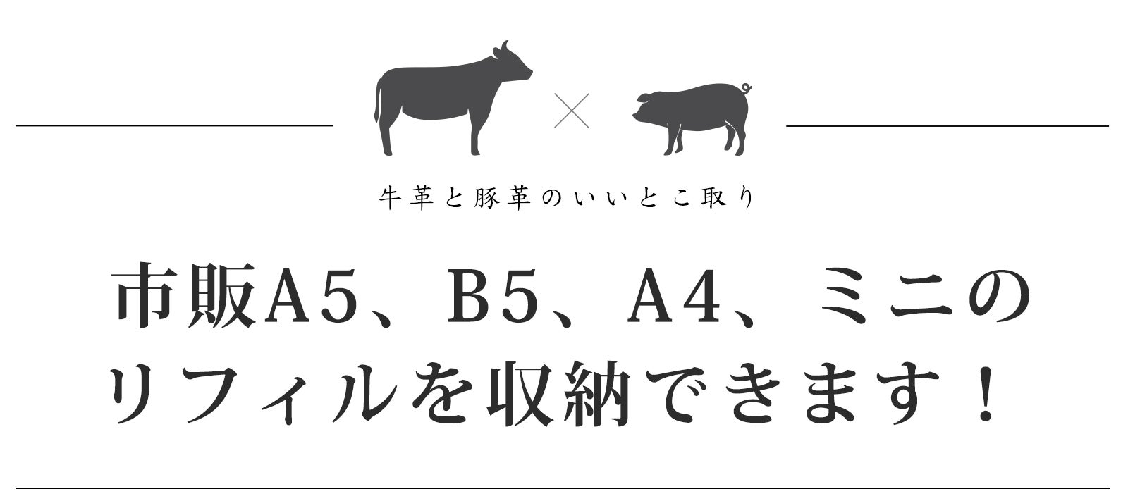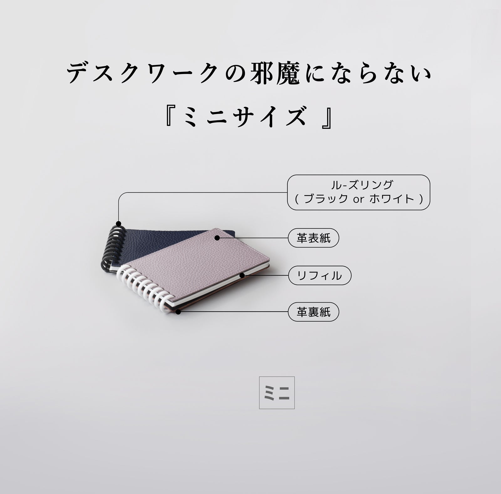 普段よく使われる「A5」、「B5」、「A4」だけでなく、パソコン前の限られたスペースにも置ける「ミニ」サイズの革表紙をご用意しました。