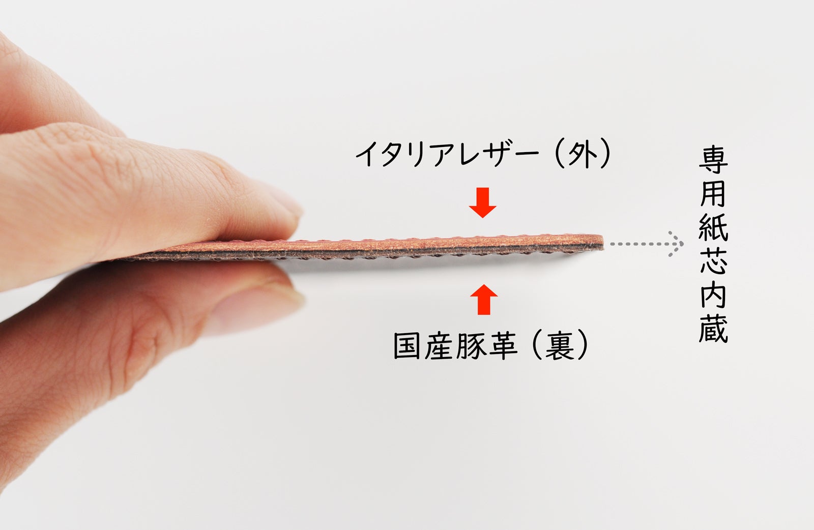 その対策として、革同士の間に伸び縮みの少ない紙芯を貼り合わせており、長く使用しても形が崩れにくく、最後までスムーズな書き心地を保てます。