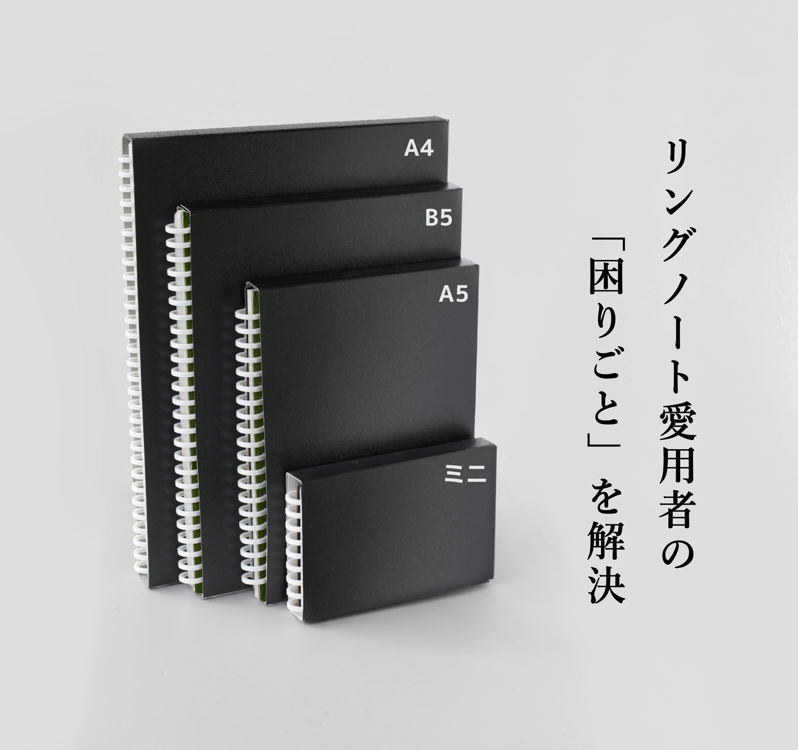 使用済みのリングノートを保管するときに、リングノート同士が互いに絡んでしまうイライラを解消するために、製品梱包の箱に着目しました。使用済みリングノートをスマートに収納できるほか、一目でわかるシールを貼れば、分類・収納も楽になります。